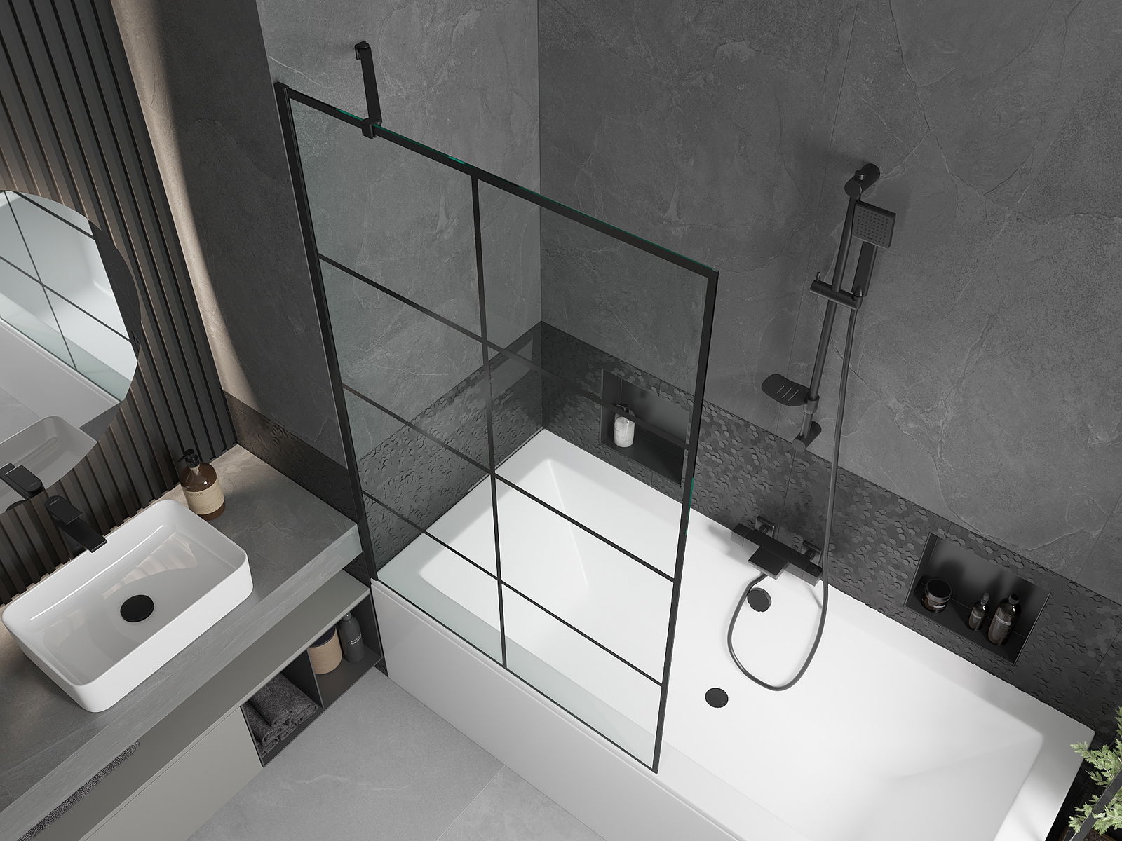 Az univerzális rögzítő rendszer használatával a képernyő jobbra vagy balra szerelhető, az Ön igényeitől függően. Ilyen módon könnyen megtervezheti a fürdőszobához szabott zuhanyt.