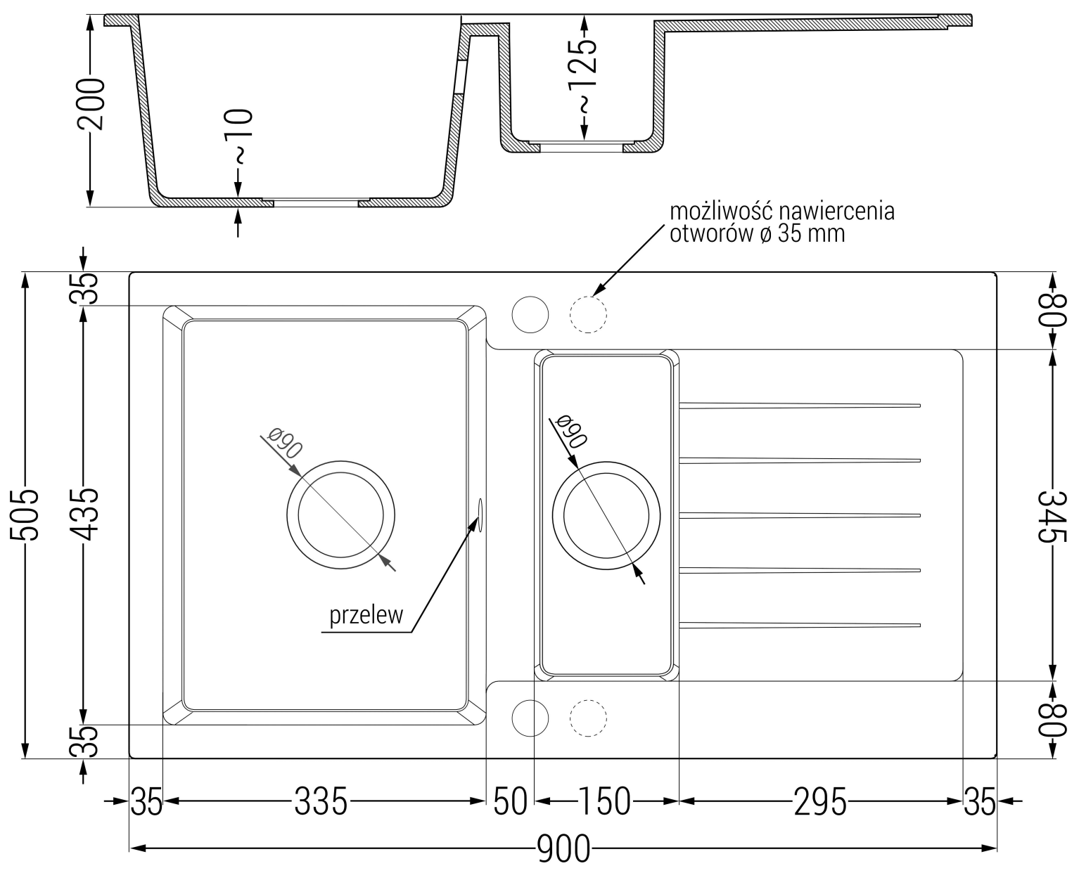 A mosogató 2 előfúrt, 35 mm átmérőjű nyílással rendelkezik, amelyeket saját kezűleg lehet kivágni. Ezek többek között felhasználhatók folyékony adagoló felszerelésére, amely megszünteti a műanyag palackok jelenlétét a konyhában, és elegáns befejezést kölcsönöz neki.