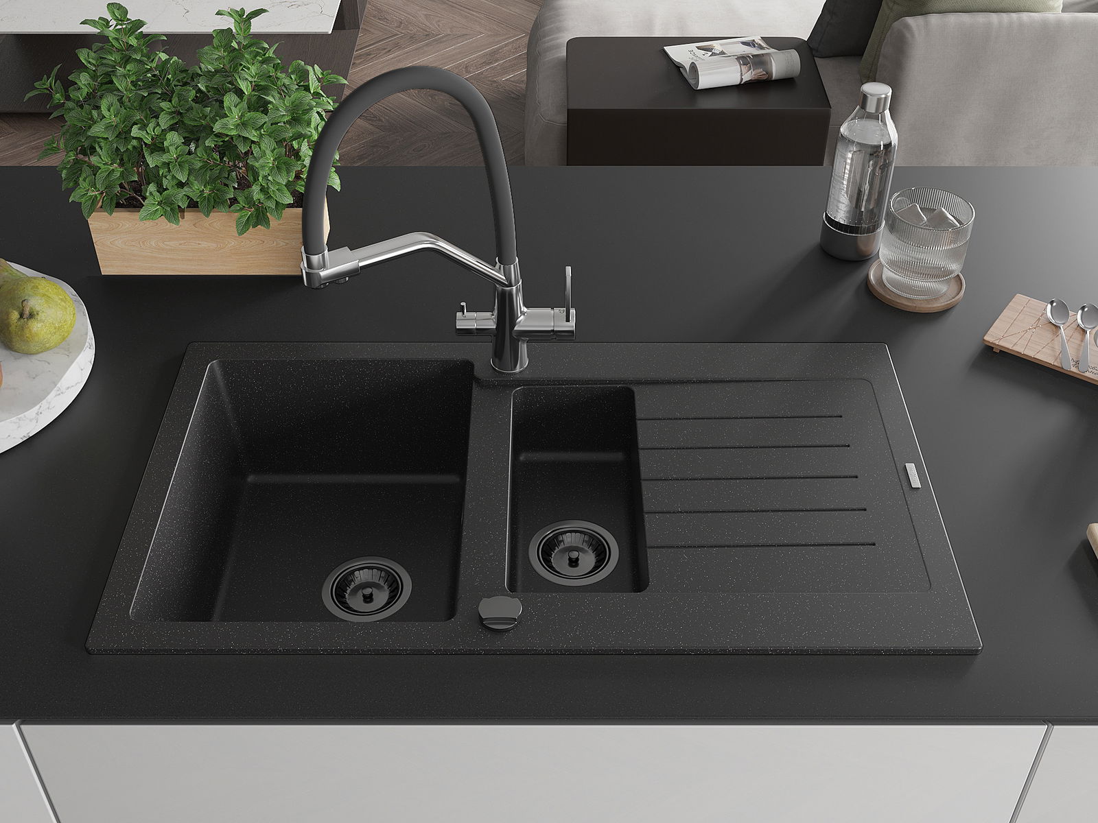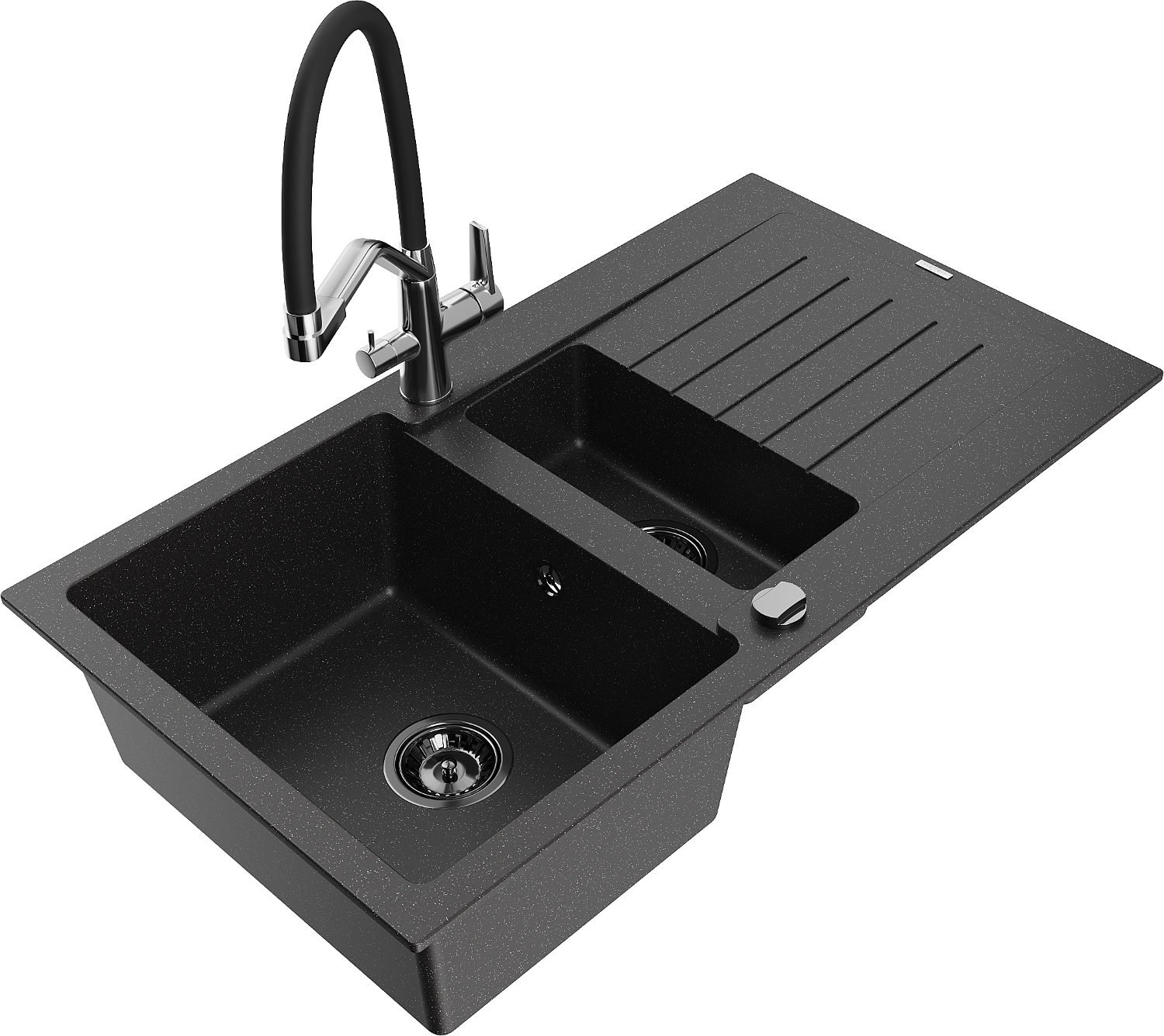 Mexen Matias 1,5 kamrás gránit mosogató csepegtetővel és Duo konyhai csappal, fekete/ezüst - 6502-73-671701-07-B
