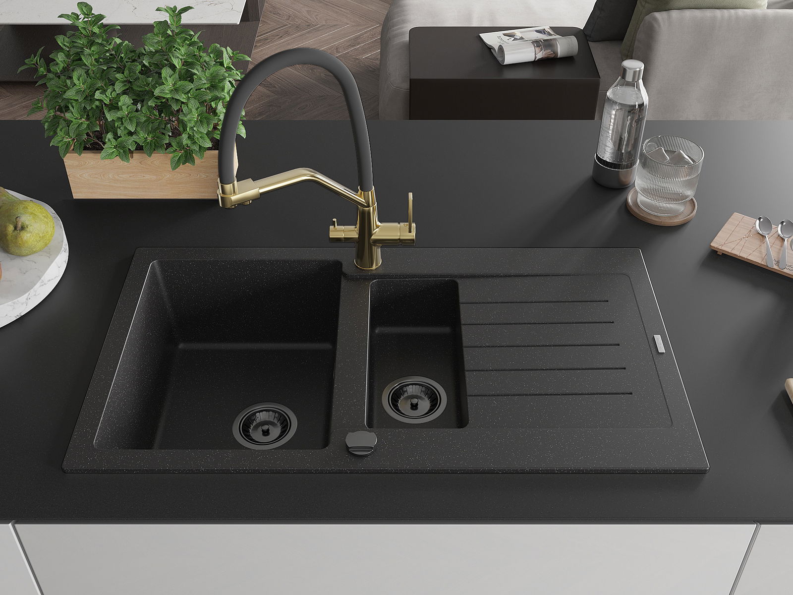Mexen Matias gránit mosogató 1,5 tálcás csepegtetővel és Duo konyhai csapteleppel, fekete/ezüst - 6502-73-671701-57-B