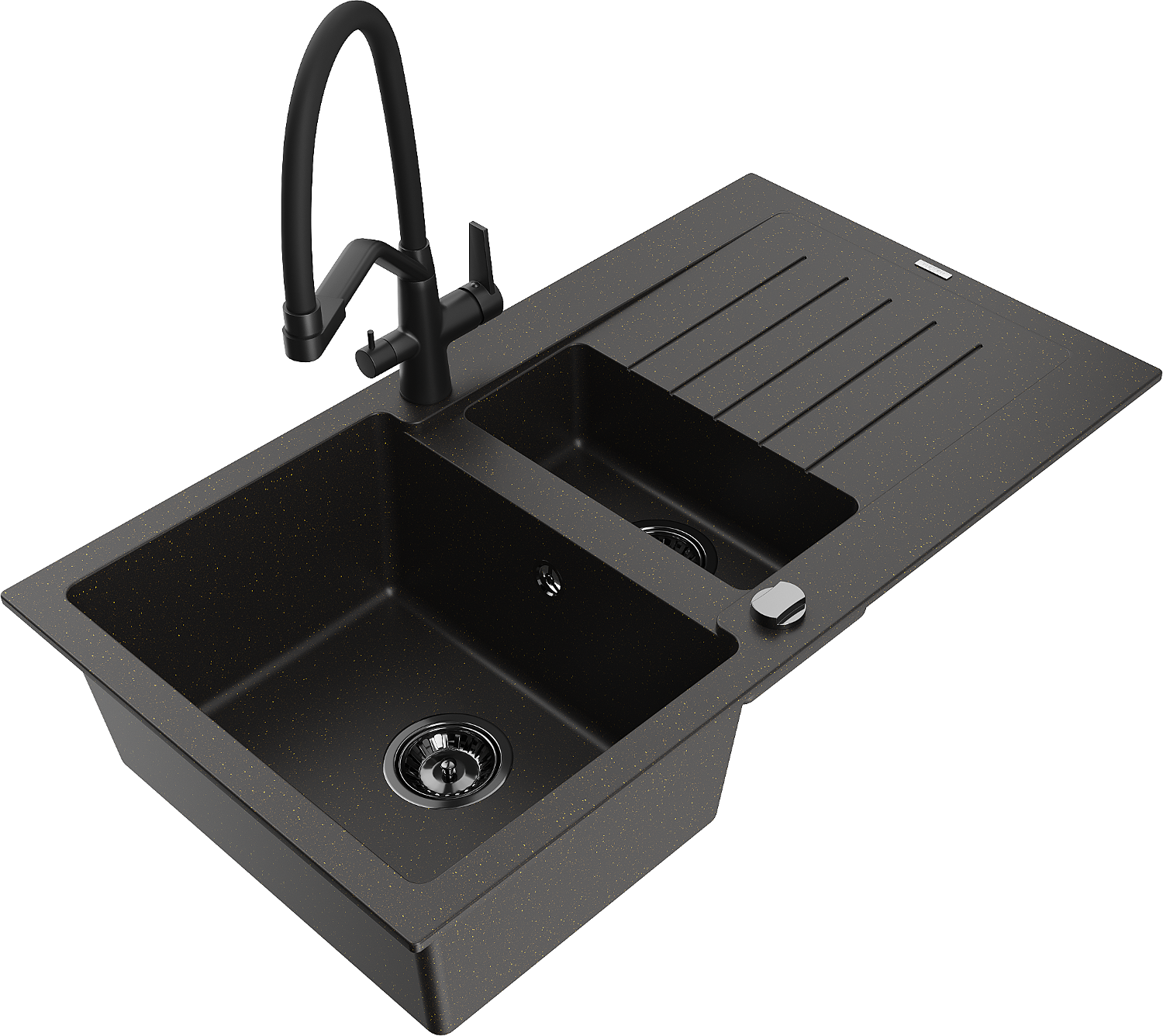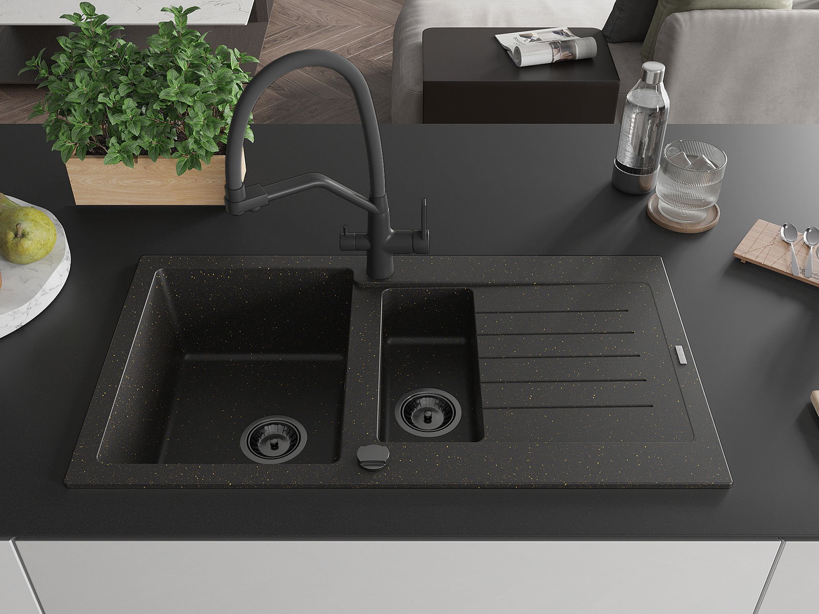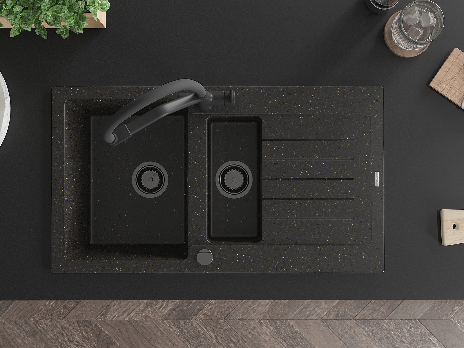 Mexen Matias gránit mosogató 1,5 rekeszes csepegtetővel és Duo konyhai csappal, fekete/arany metál - 6502-75-671701-70-B