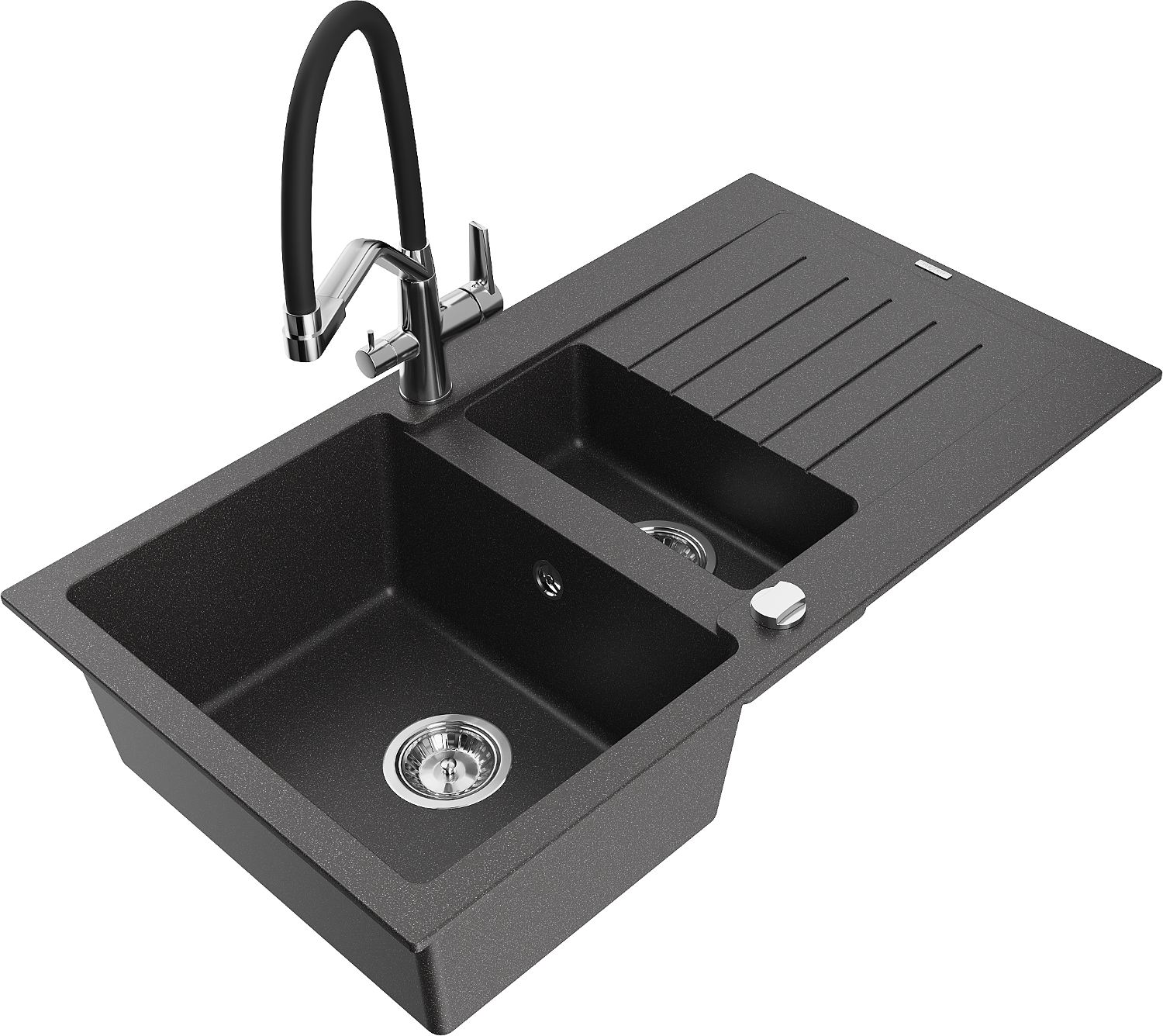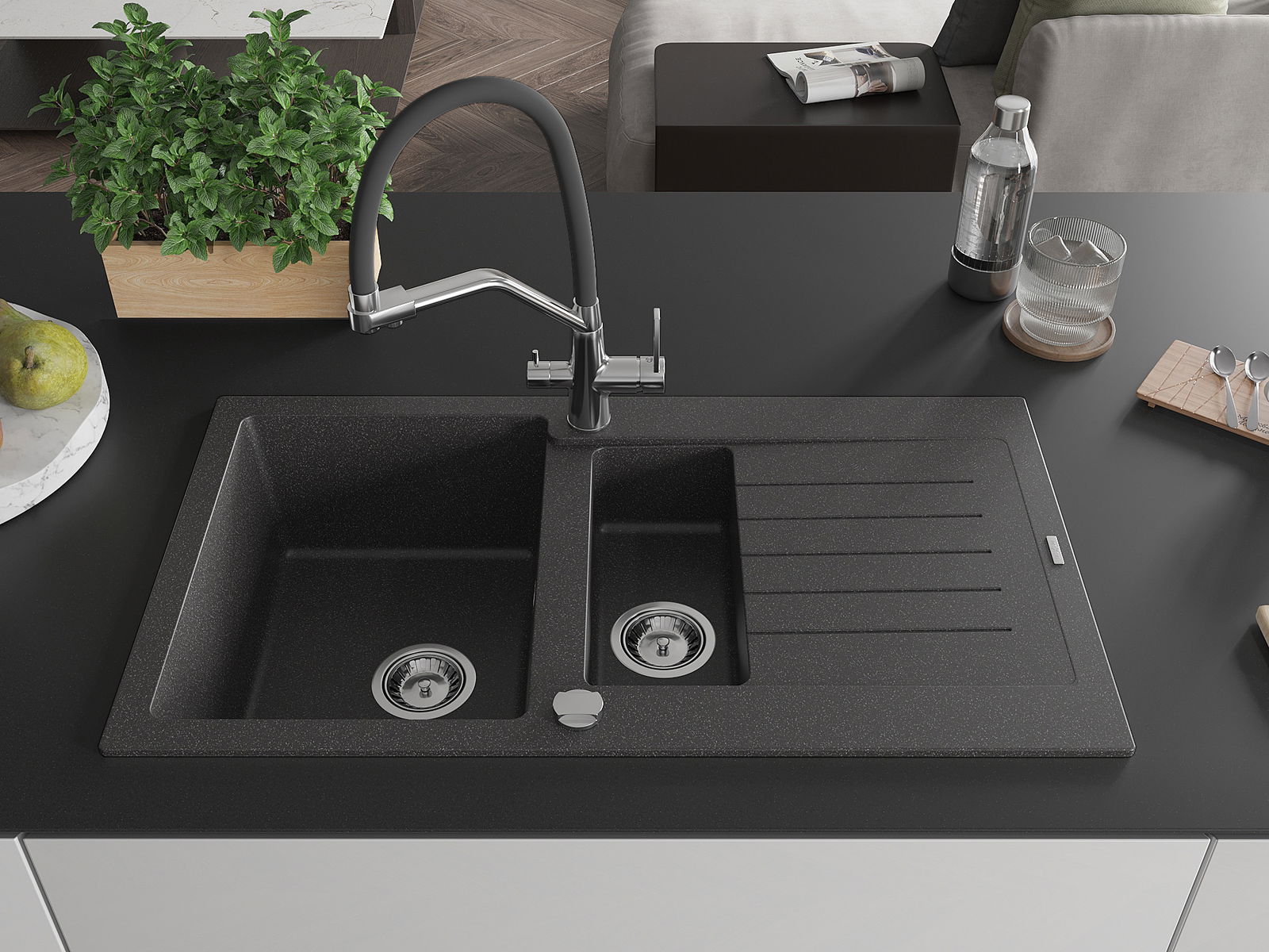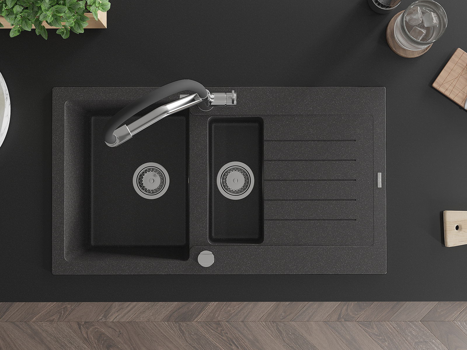Mexen Matias gránit mosogatótálca 1,5-medencés csepegtetővel és Duo konyhai csapteleppel, fekete pöttyös - 6502-76-671701-07