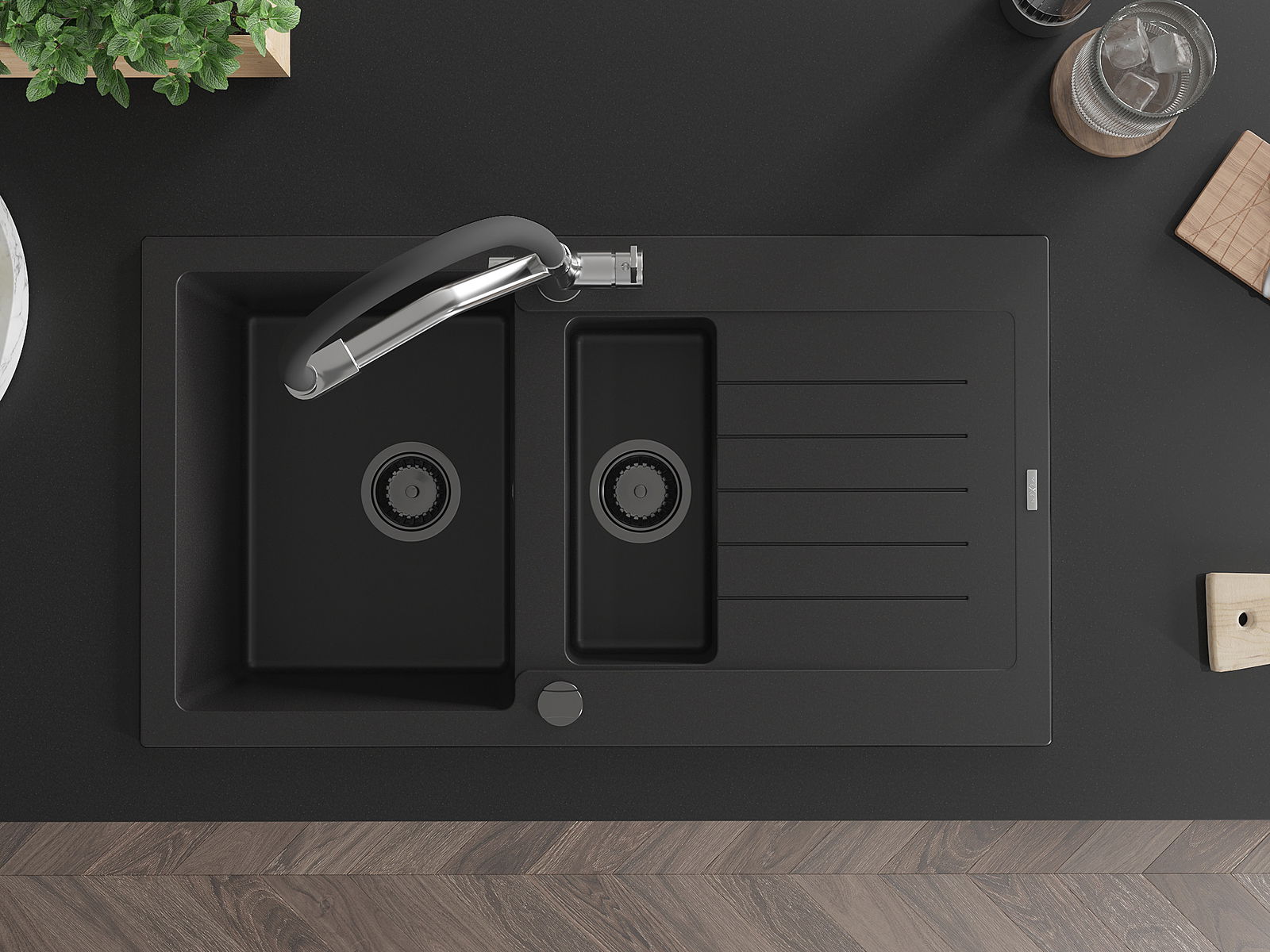 A mosogató kiváló minőségű gránitból készül. Ez egy elegáns és mindenekelőtt minden konyhához praktikus kiegészítés, stílusától függetlenül. A kiváló minőségű és a gránit tartósság biztosítja a sok éves használatát.