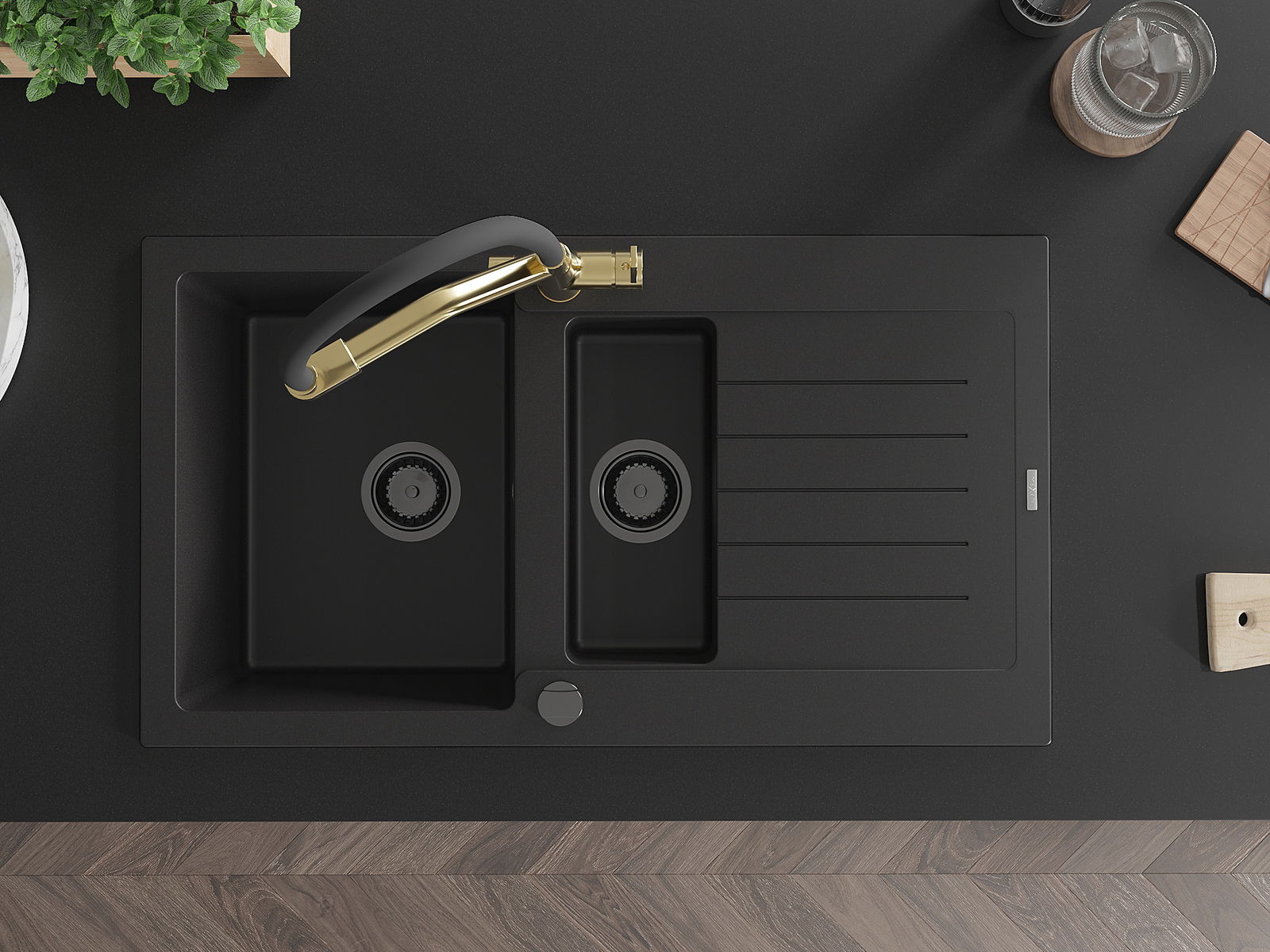 Mexen Matias 1,5-medencés gránit mosogató csepegtetővel és Duo konyhai csappal, fekete - 6502-77-671701-57-B