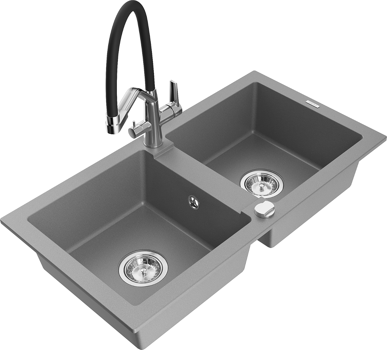 Mexen Mario gránit mosogatótálca két rekesszel és Duo konyhai csapteleppel, szürke - 6504-71-671701-07