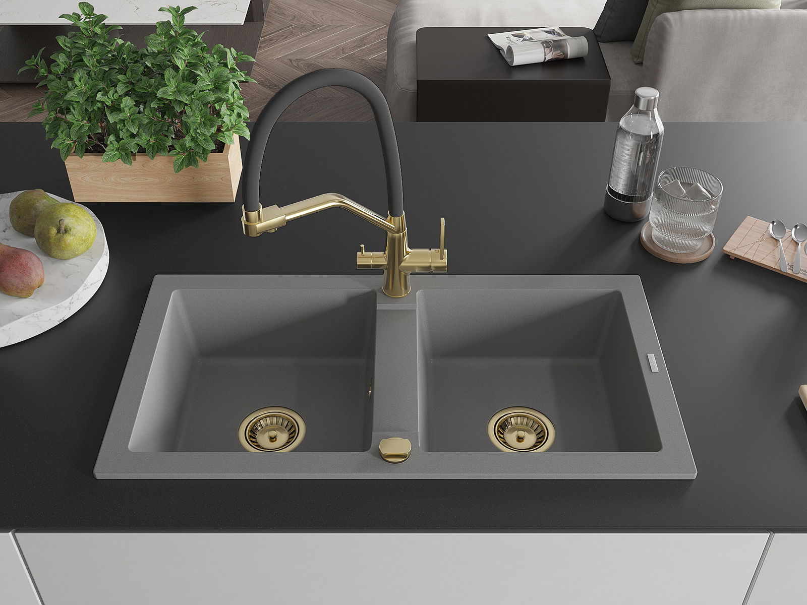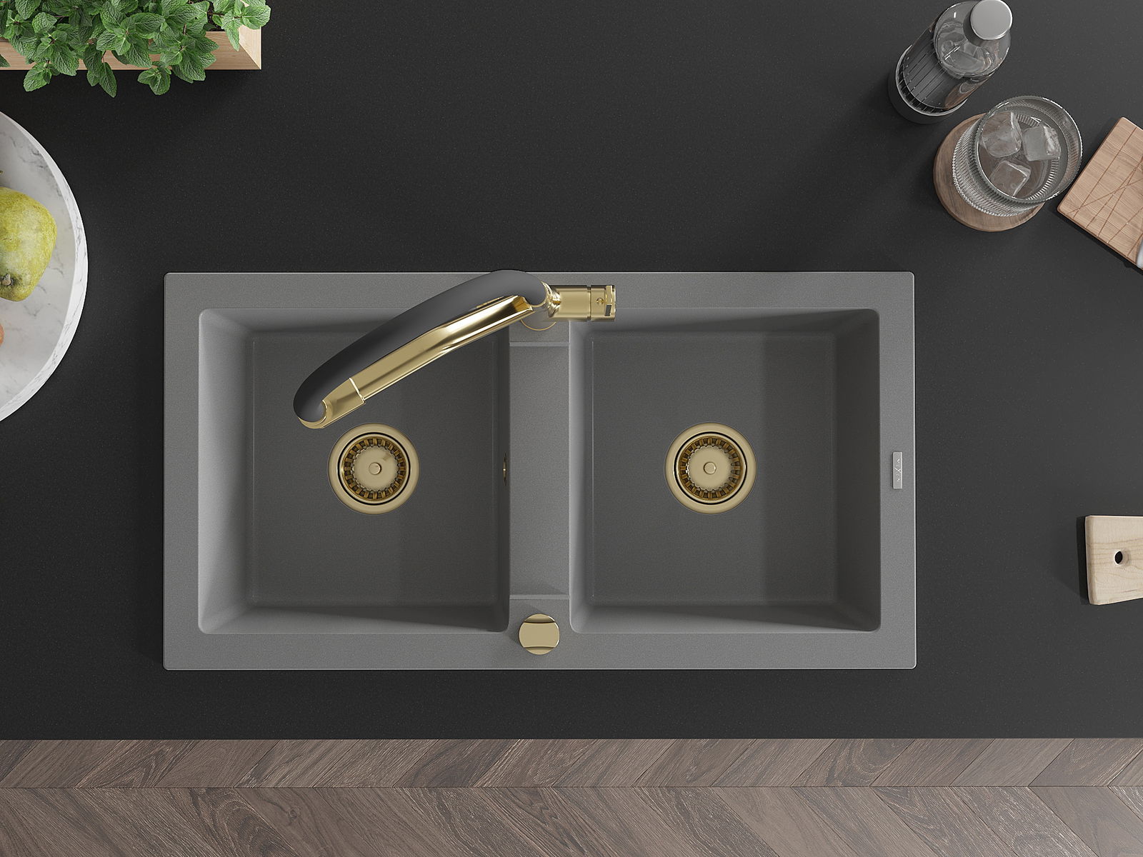 Mexen Mario gránit mosogató 2 rekeszes, Duo konyhai csapteleppel, szürke - 6504-71-671701-57-G