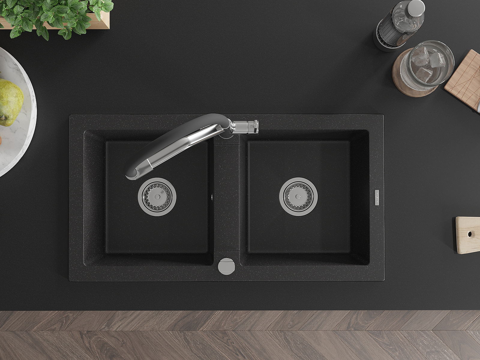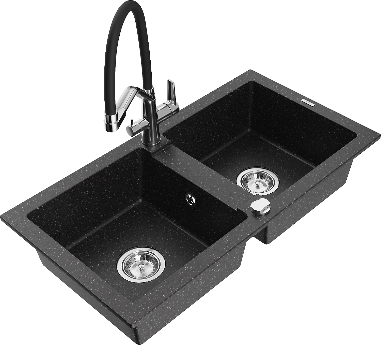 Mexen Mario 2 rekeszes gránit mosogató Duo konyhai csapteleppel, fekete/ezüst metál - 6504-73-671701-07