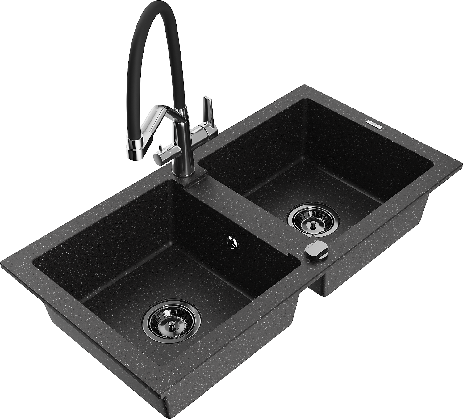 Mexen Mario gránit mosogató kétkamrás konyhai csapteleppel Duo, fekete/ezüst metál - 6504-73-671701-07-B