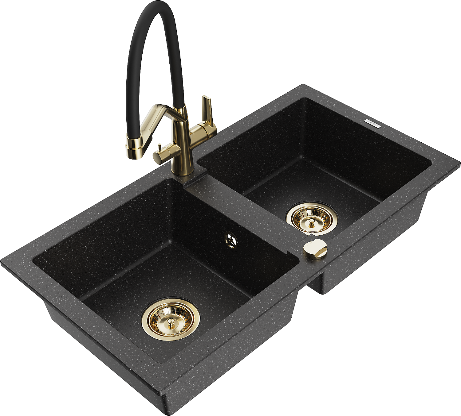 Mexen Mario 2 rekeszes gránit mosogató Duo konyhai csapteleppel, fekete/ezüst metál - 6504-73-671701-57-G