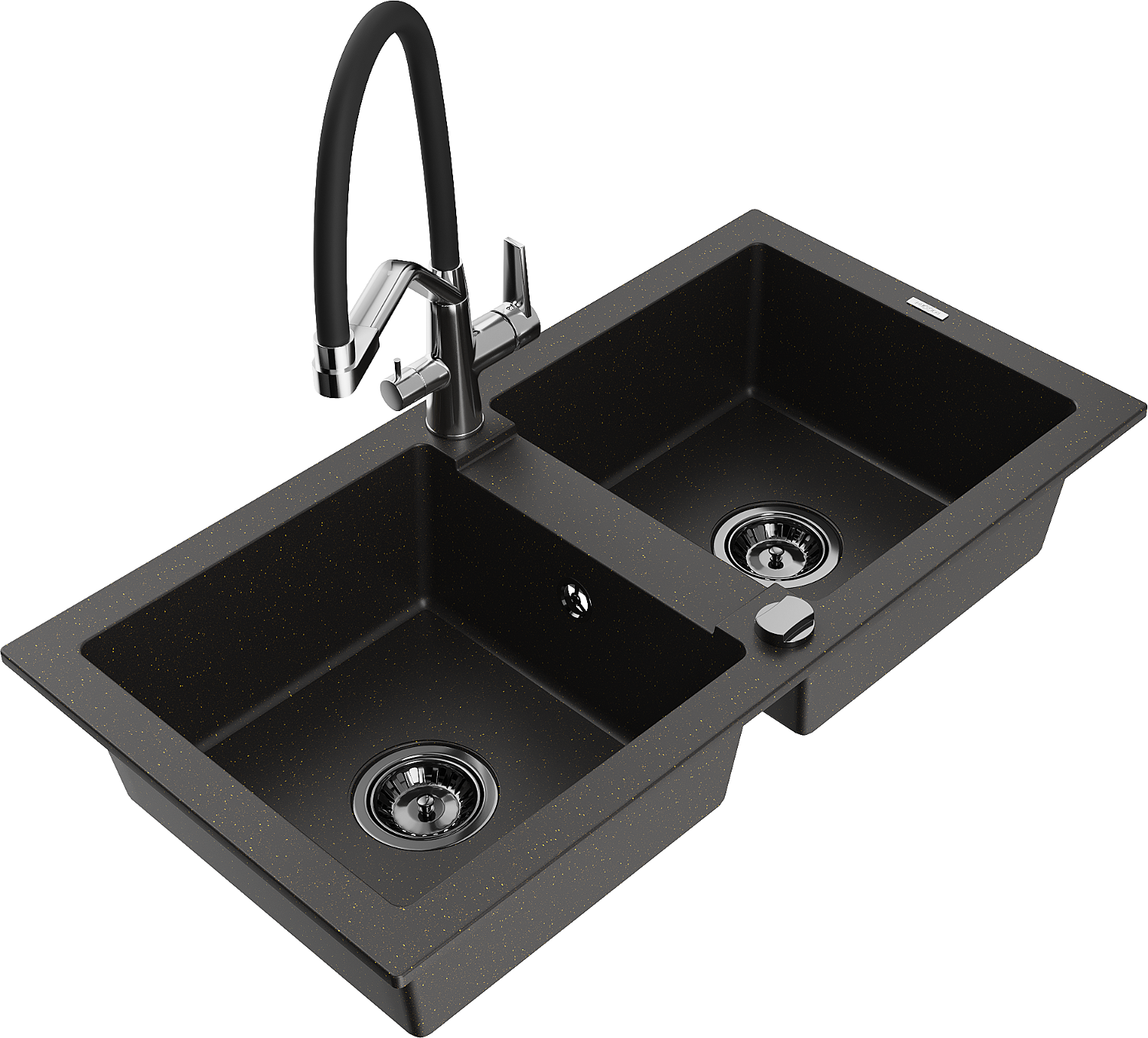 Mexen Mario 2 rekeszes gránit mosogató Duo konyhai csapteleppel, fekete/arany metál - 6504-75-671701-07-B