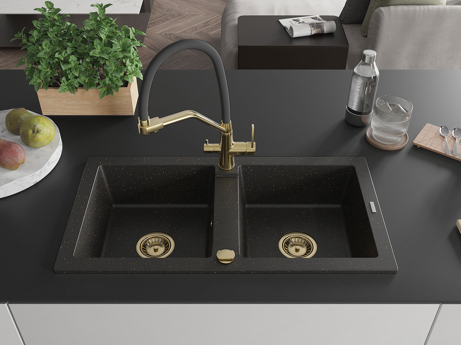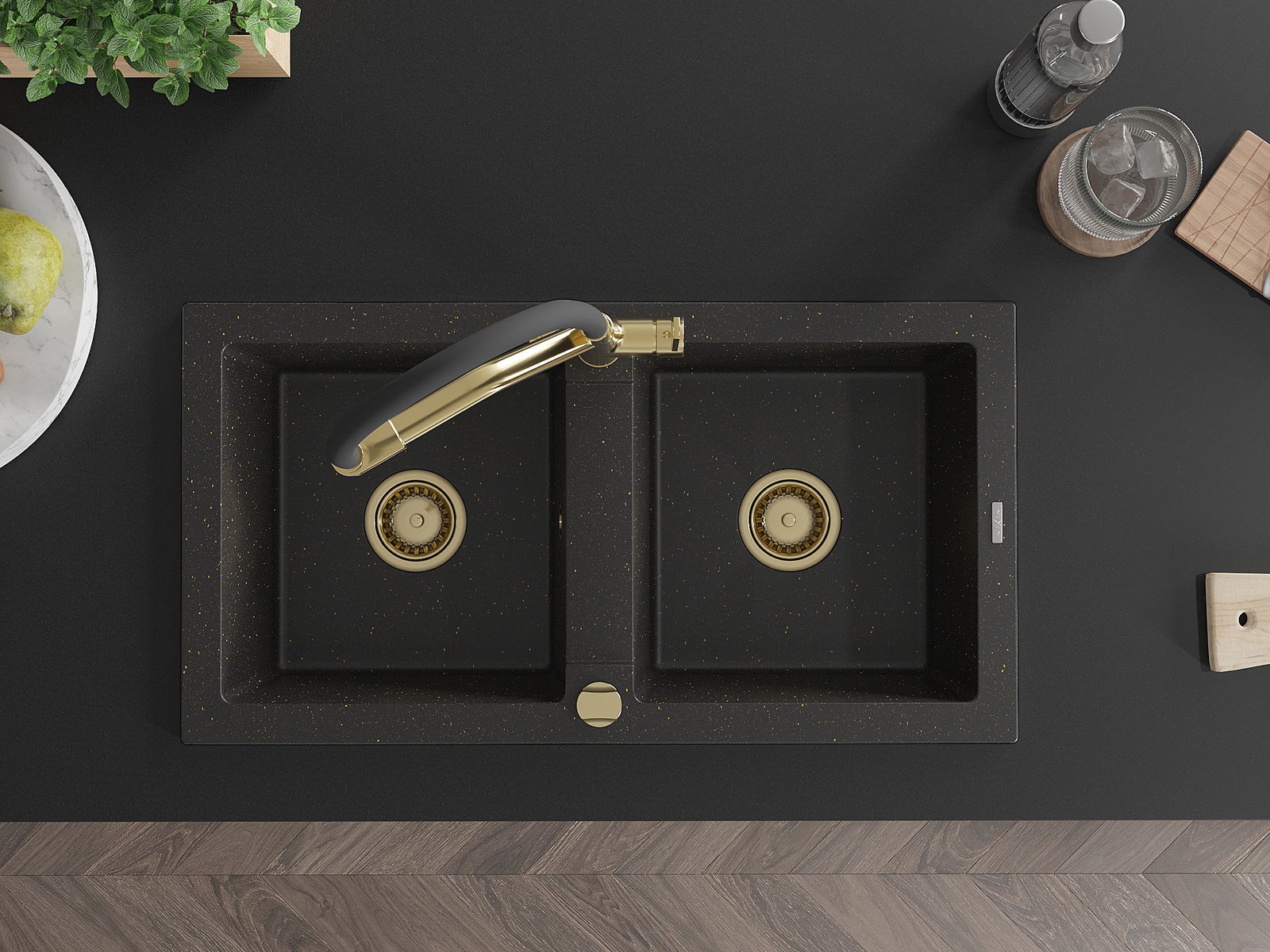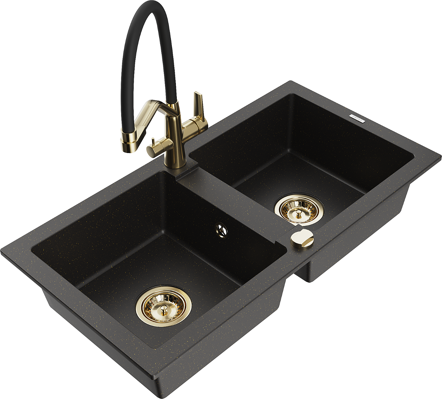 Mexen Mario gránit mosogató 2-medencés konyhai csappal Duo, fekete/arany metál - 6504-75-671701-57-G
