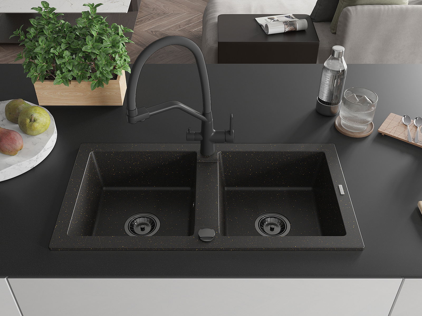 Mexen Mario 2-medencés gránit mosogató, Duo konyhai csapteleppel, fekete/arany metál - 6504-75-671701-70-B