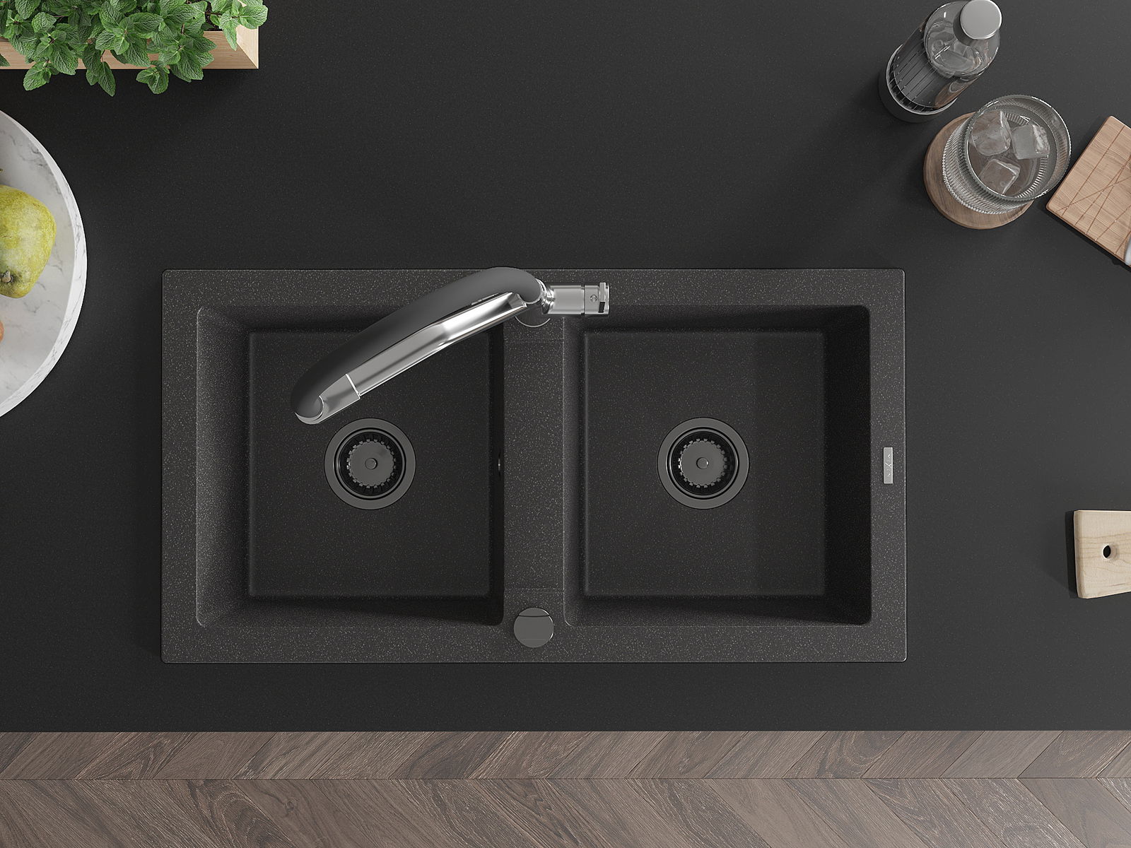 Mexen Mario gránit mosogató 2-medencés konyhai csappal Duo, fekete pöttyös - 6504-76-671701-07-B