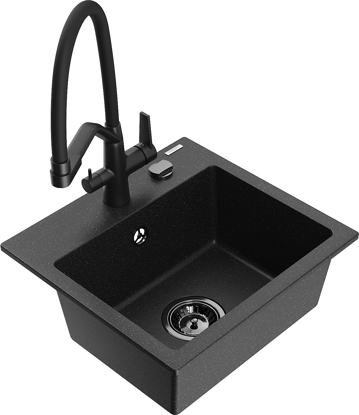 Mexen Milo 1-medencés gránit mosogató Duo konyhai csapteleppel, fekete/ezüst metál - 6505-73-671701-70-B