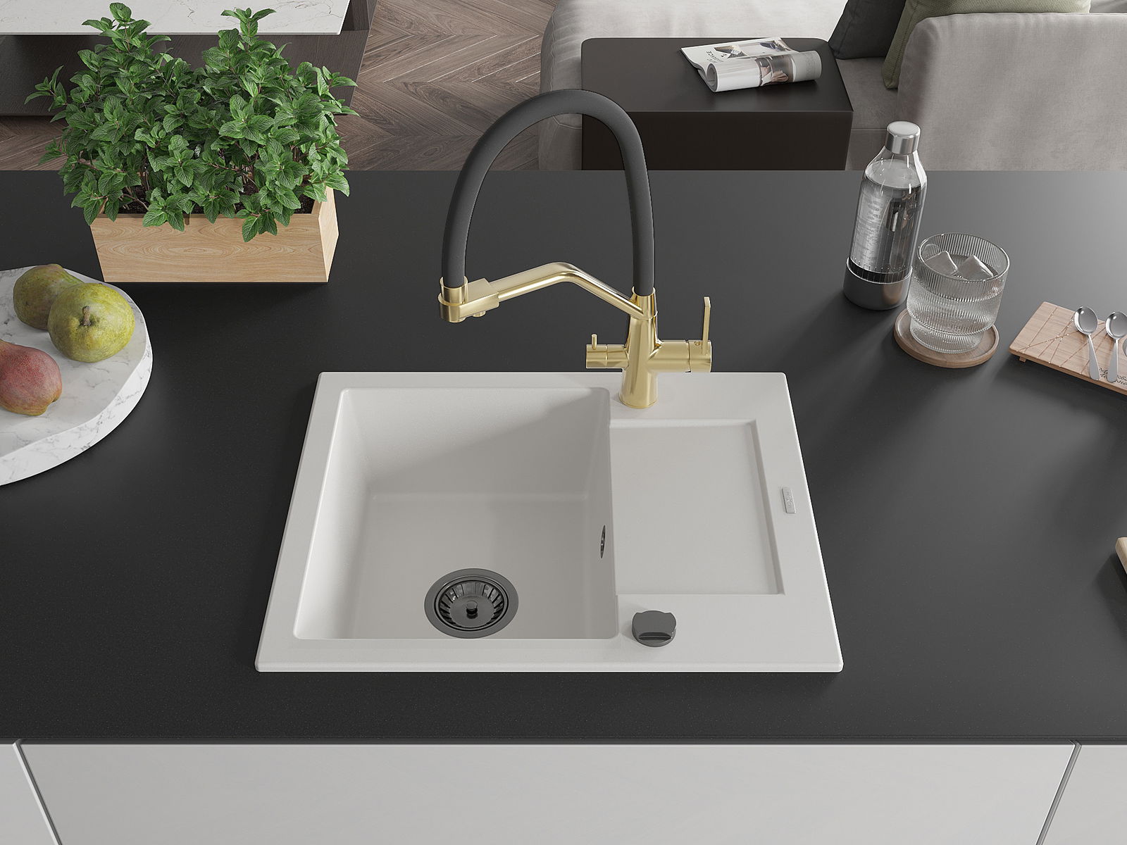 Mexen Enzo egytálcás gránit mosogató csepegtetővel és Duo konyhai csappal, fehér - 6506-20-671701-57-B
