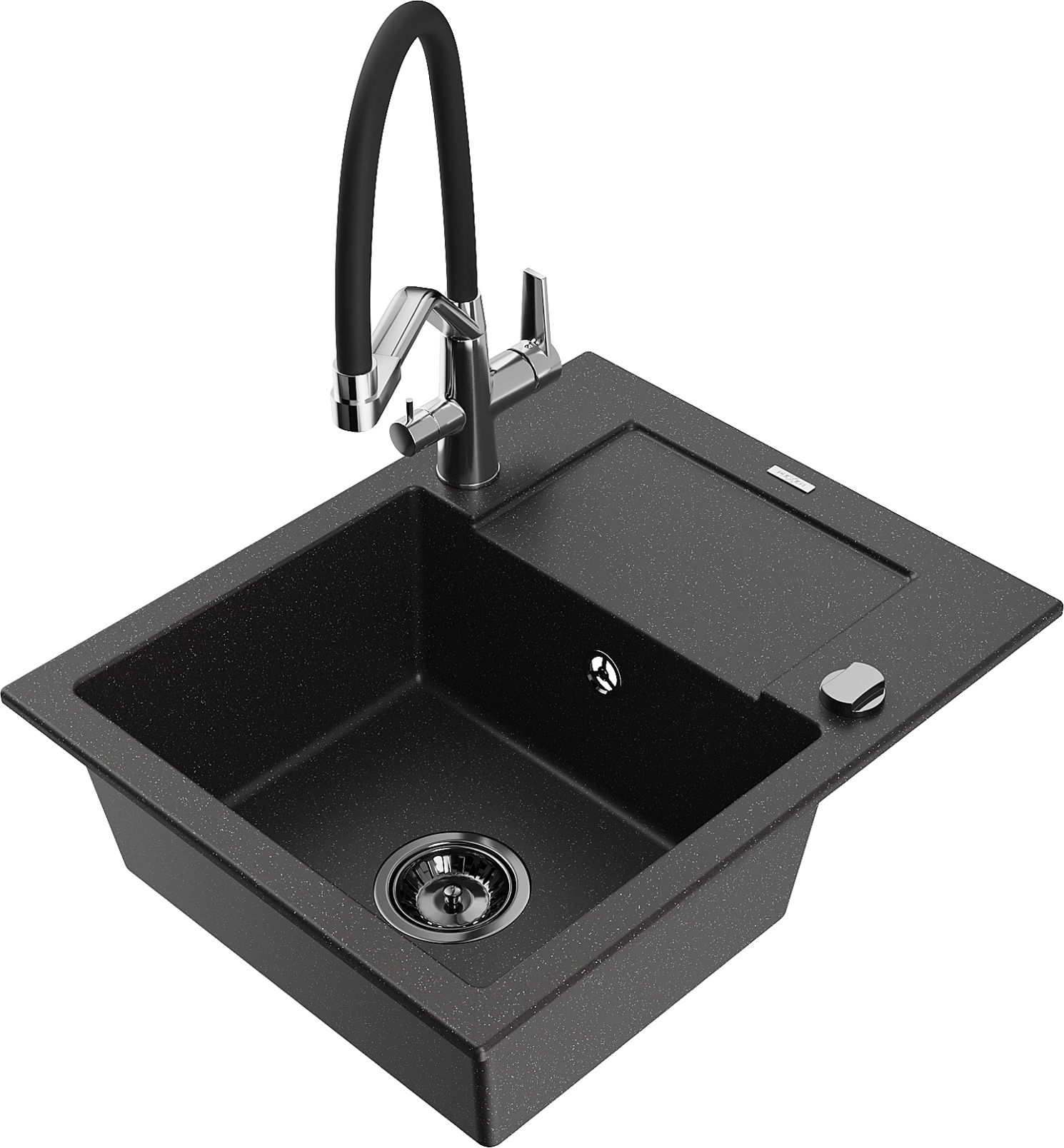 Mexen Enzo egykamrás gránit mosogatótálca csepegtetővel és Duo konyhai csapteleppel, fekete/ezüst metál - 6506-73-671701-07-B