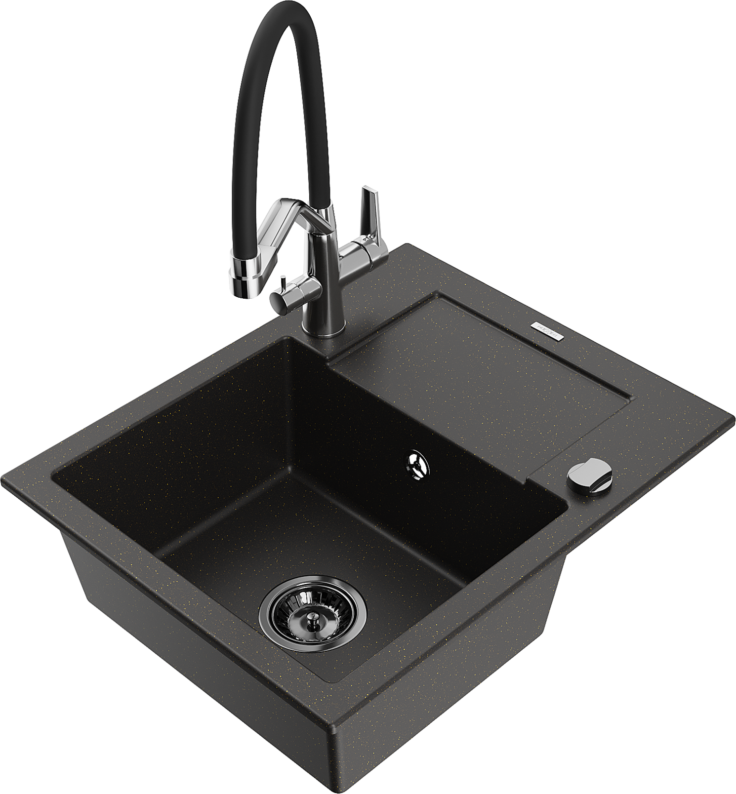 Mexen Enzo gránit mosogató 1 medencés lefolyóval és Duo konyhai keverőcsappal, fekete/arany metál - 6506-75-671701-07-B