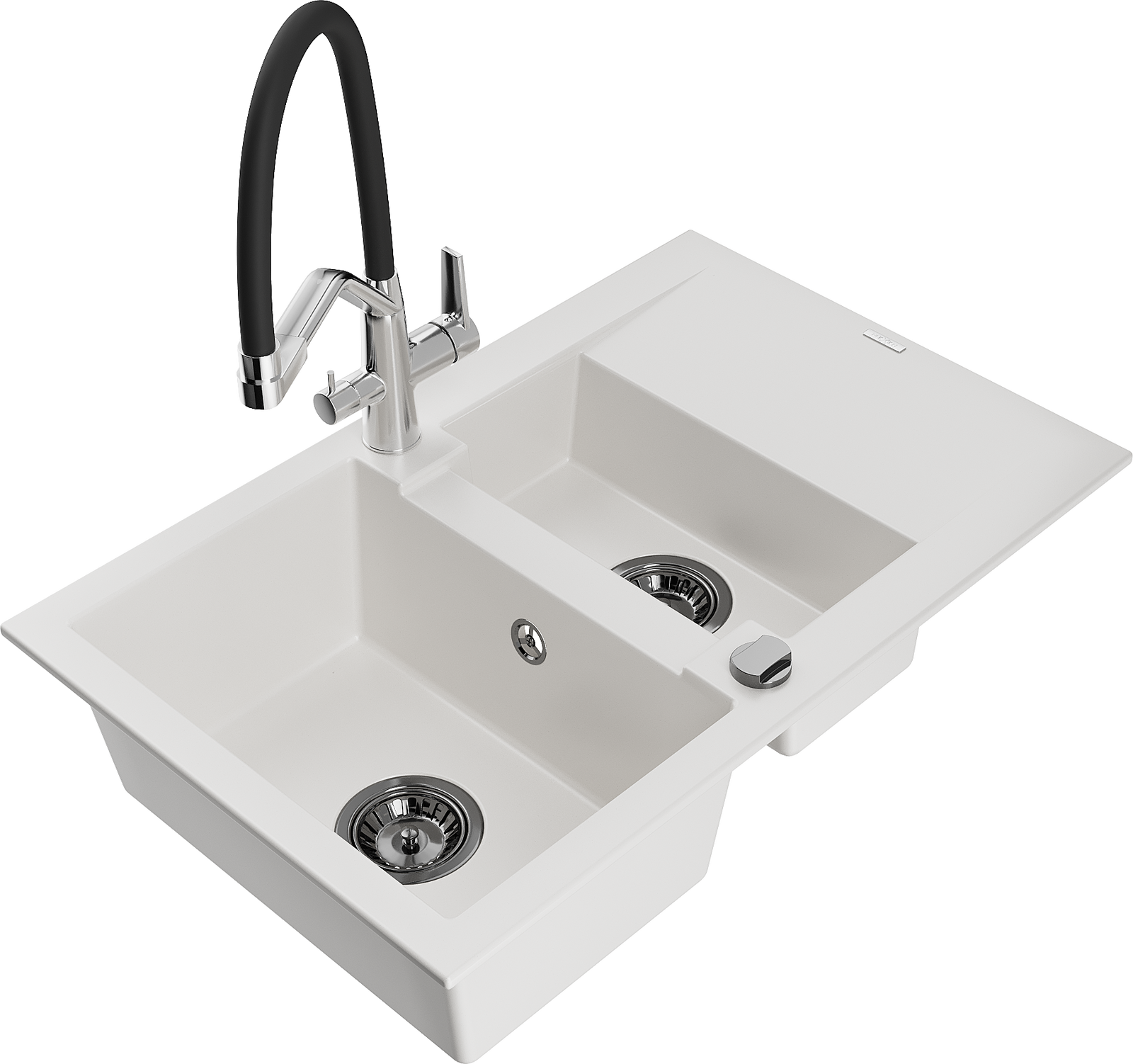 Mexen Gaspar 1,5 rekeszes gránit mosogató csepegtetővel és Duo konyhai csapteleppel, fehér - 6507-20-671701-07-B