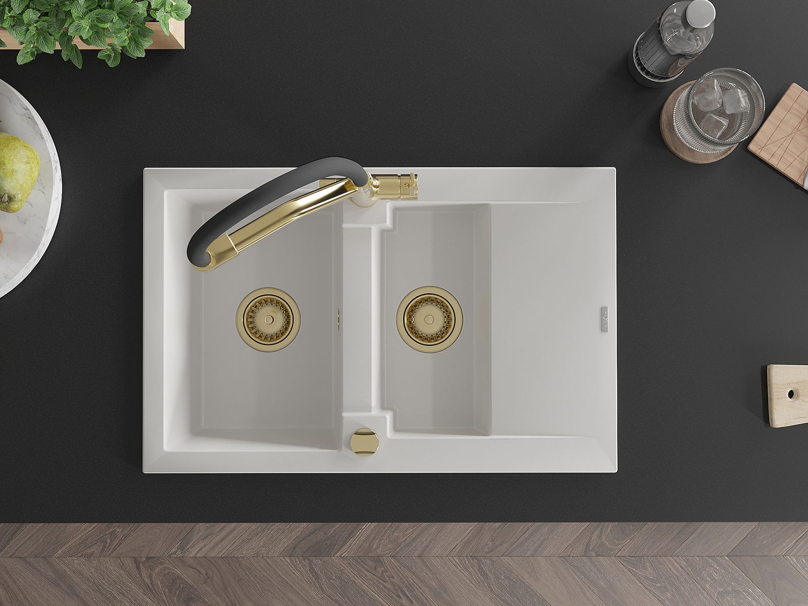 Mexen Gaspar gránit mosogatótálca 1,5 rekeszes csepegtetővel és Duo konyhai csapteleppel, fehér - 6507-20-671701-57-G