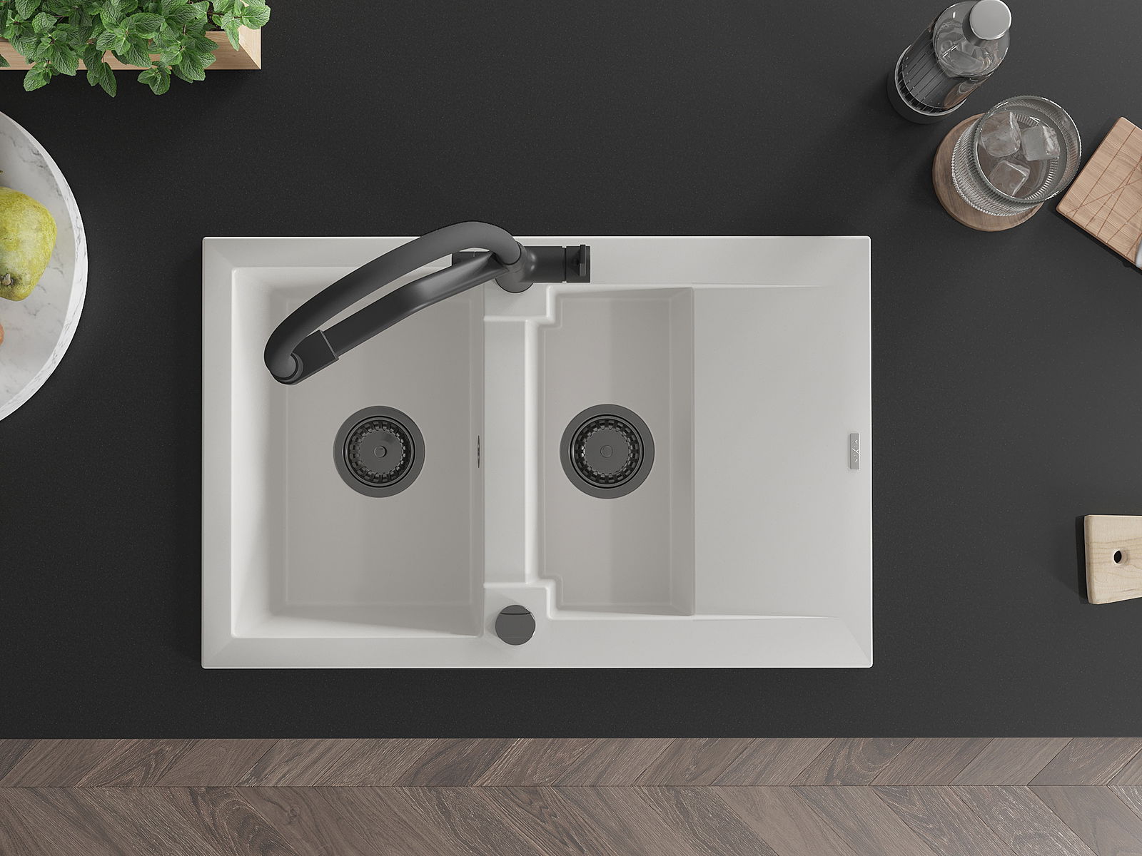 Mexen Gaspar gránit mosogató 1,5 medencés csepegtetővel és Duo konyhai csapteleppel, fehér - 6507-20-671701-70-B