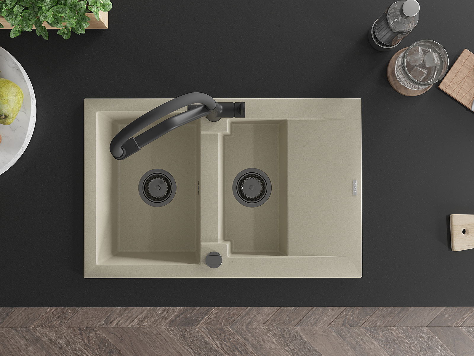 Mexen Gaspar gránit mosogatótálca 1,5 rekeszes csepegtetővel és Duo konyhai csapteleppel, bézs - 6507-69-671701-70-B