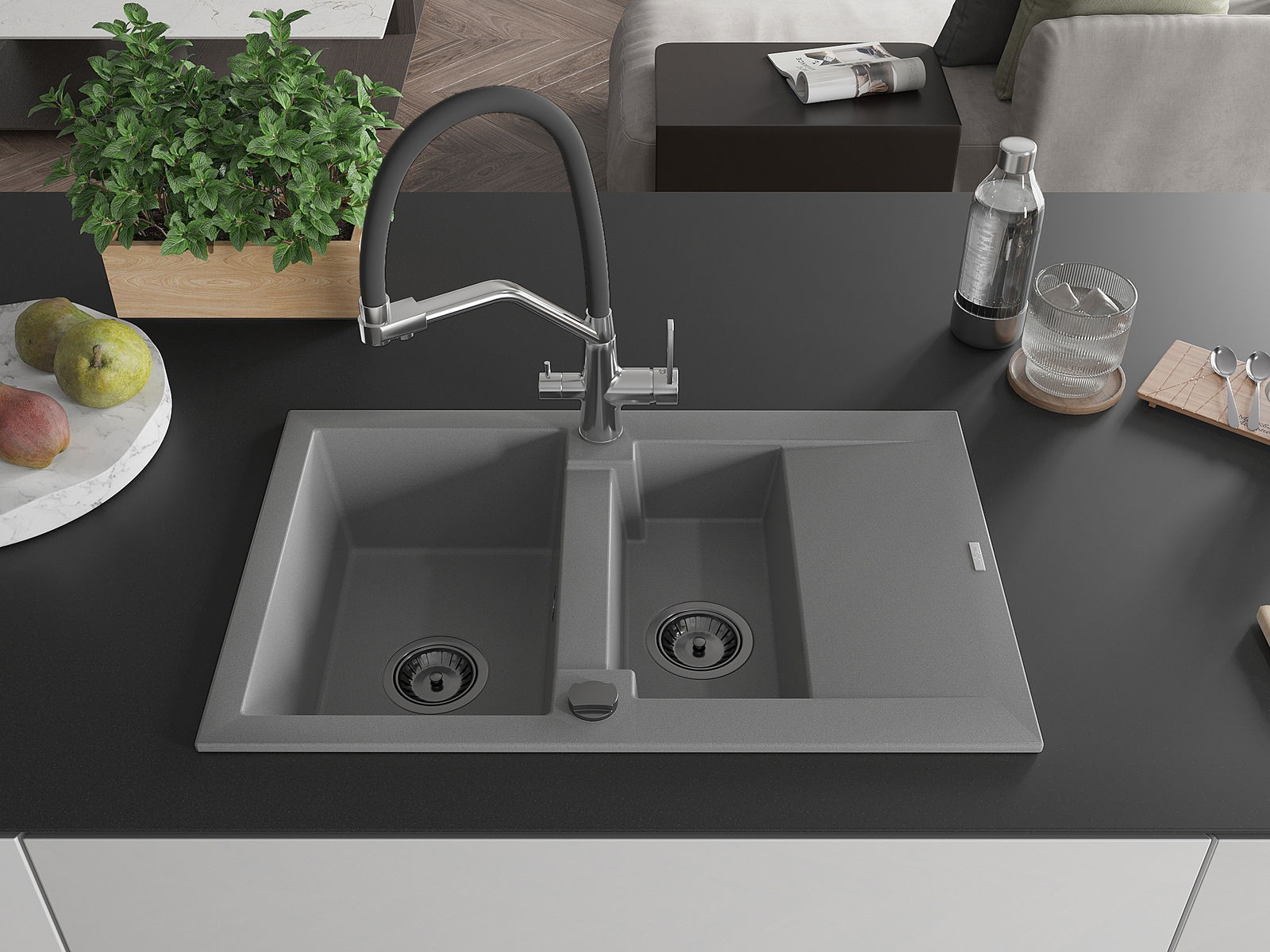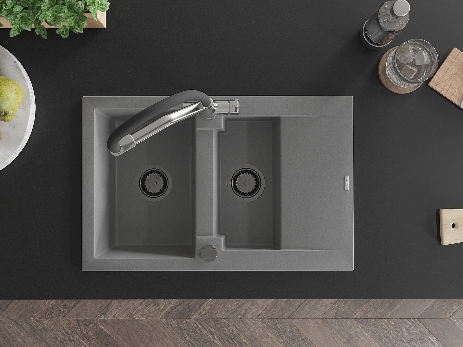 Mexen Gaspar szürke gránit mosogató 1,5 rekeszes csepegtetővel és Duo konyhai csapteleppel - 6507-71-671701-07-B