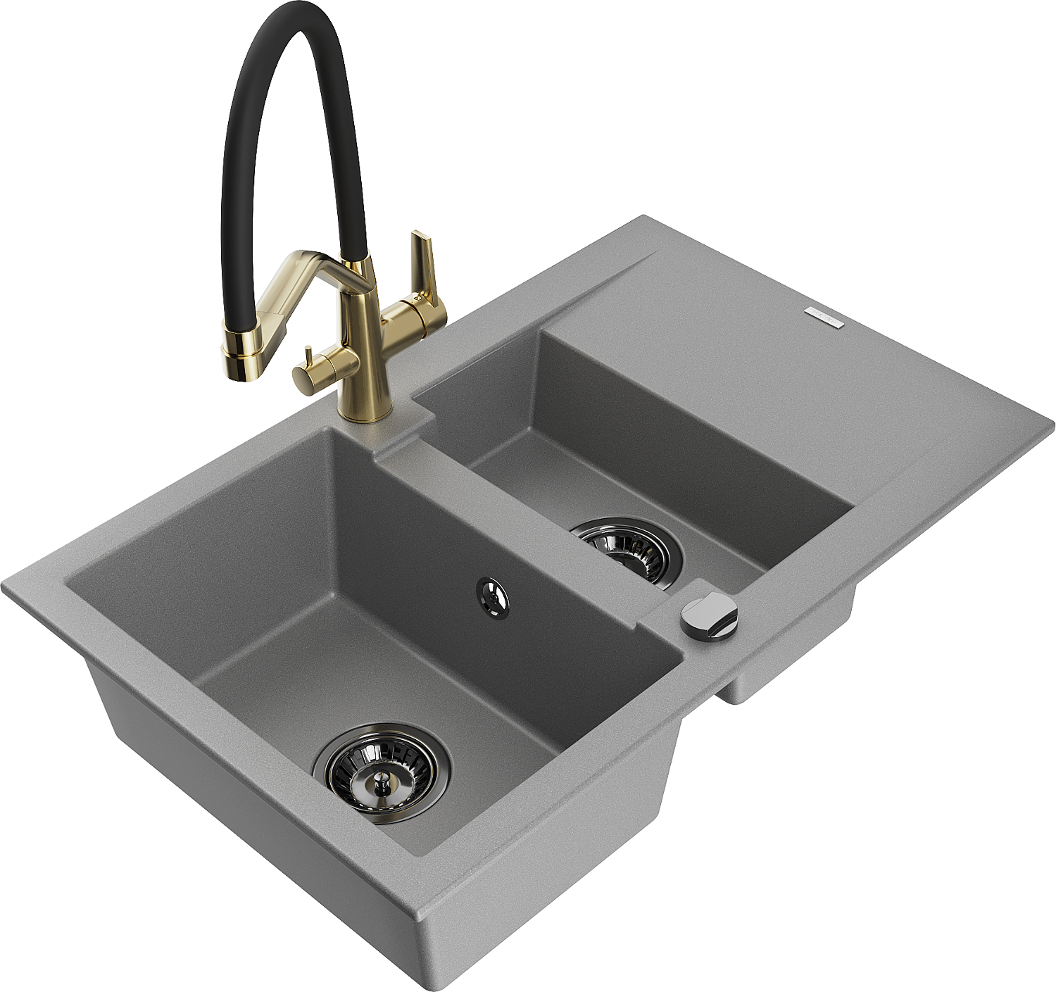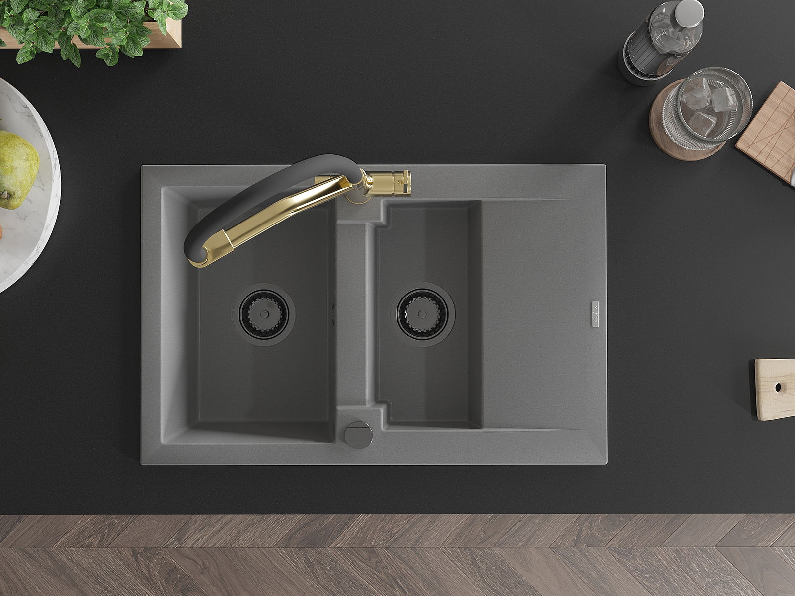Mexen Gaspar gránit mosogató 1,5-medencés csepegtetővel és Duo konyhai csappal, szürke - 6507-71-671701-57-B