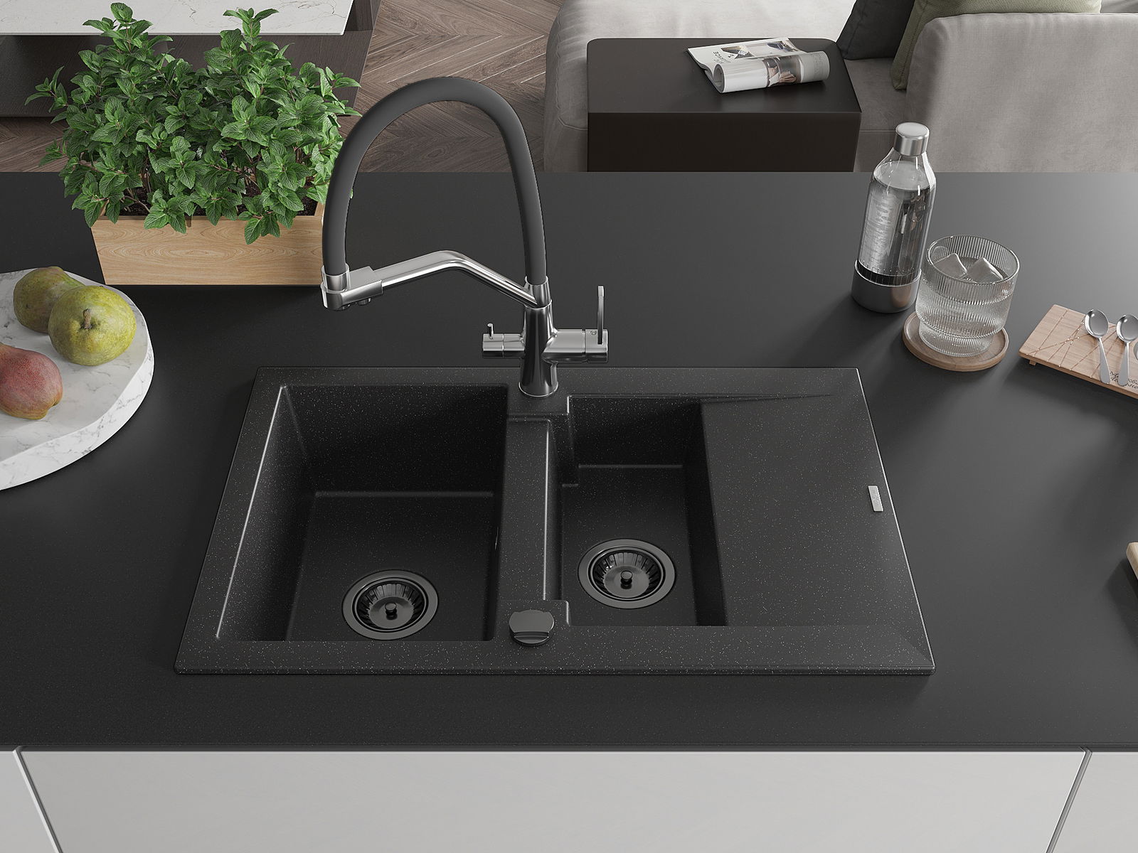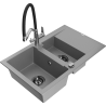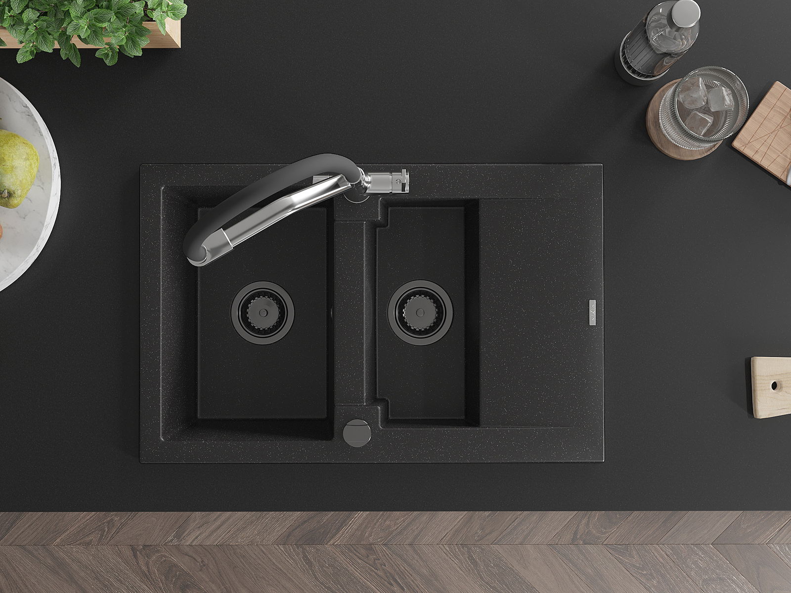 Mexen Gaspar gránit mosogató 1,5 kamrás csepegtetővel és Duo konyhai csappal, fekete/ezüst - 6507-73-671701-07-B
