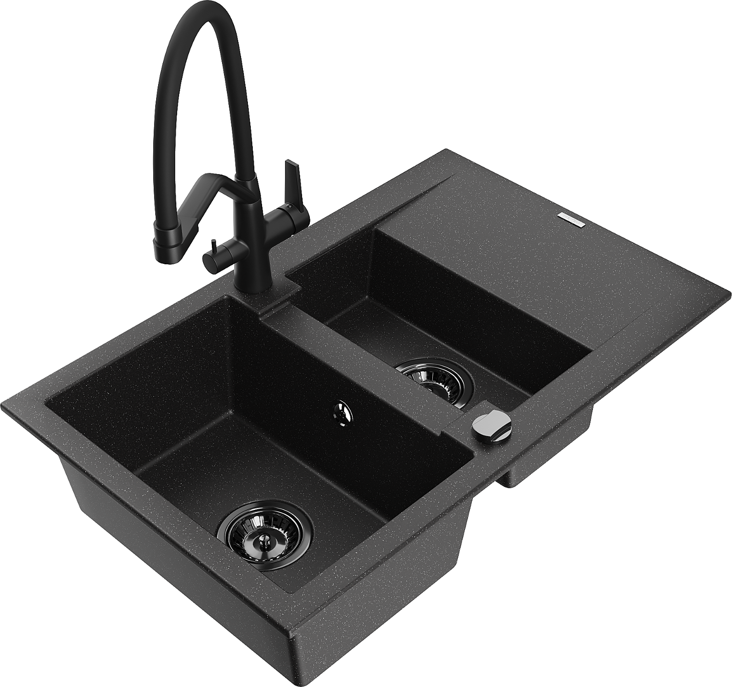 Mexen Gaspar gránit mosogatótálca 1,5-medencés csepegtetővel és Duo konyhai csappal, fekete/ezüst - 6507-73-671701-70-B