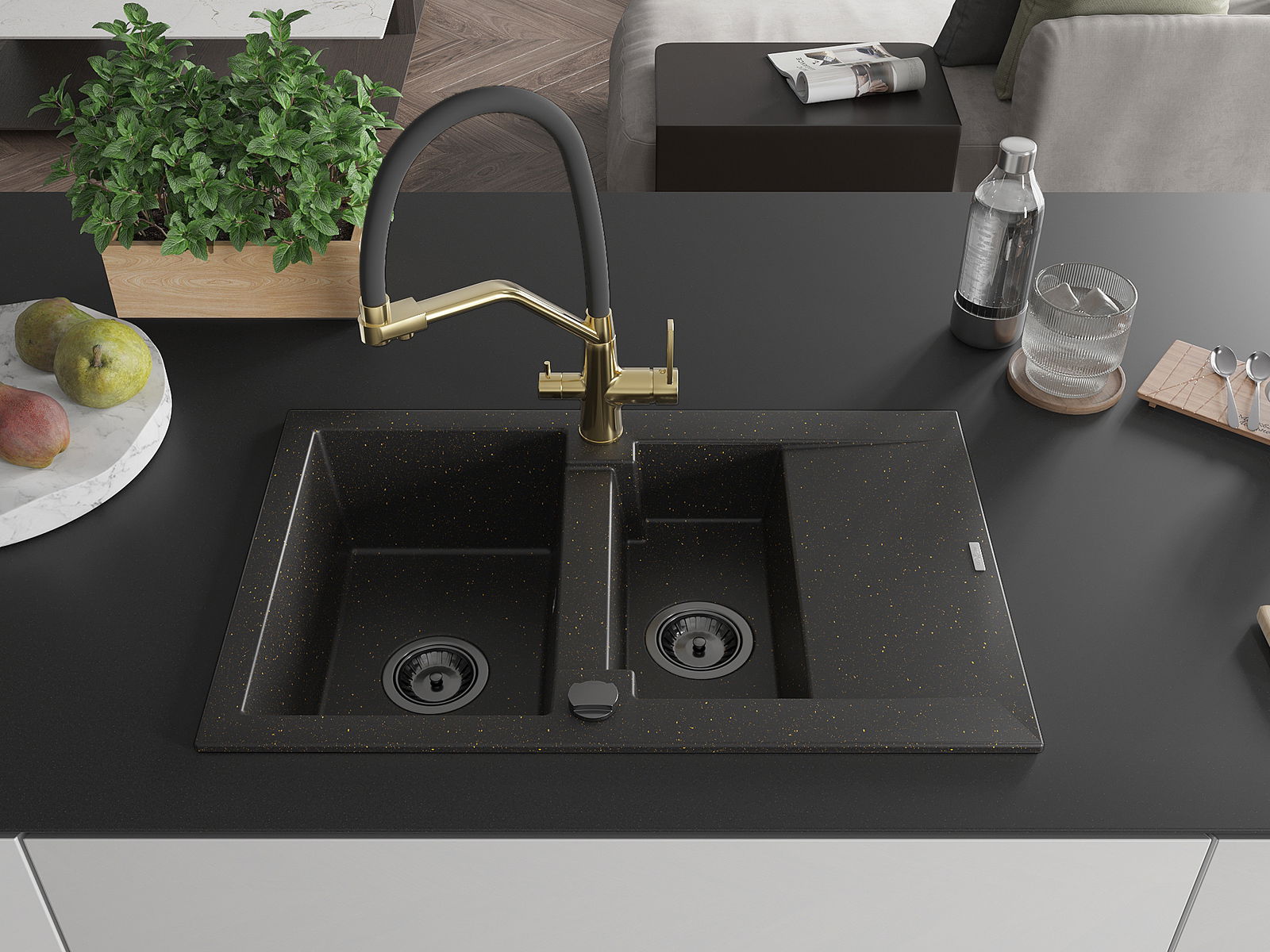 Mexen Gaspar 1,5 rekeszes gránit mosogató csepegtetővel és Duo konyhai csappal, fekete/arany metál - 6507-75-671701-57-B