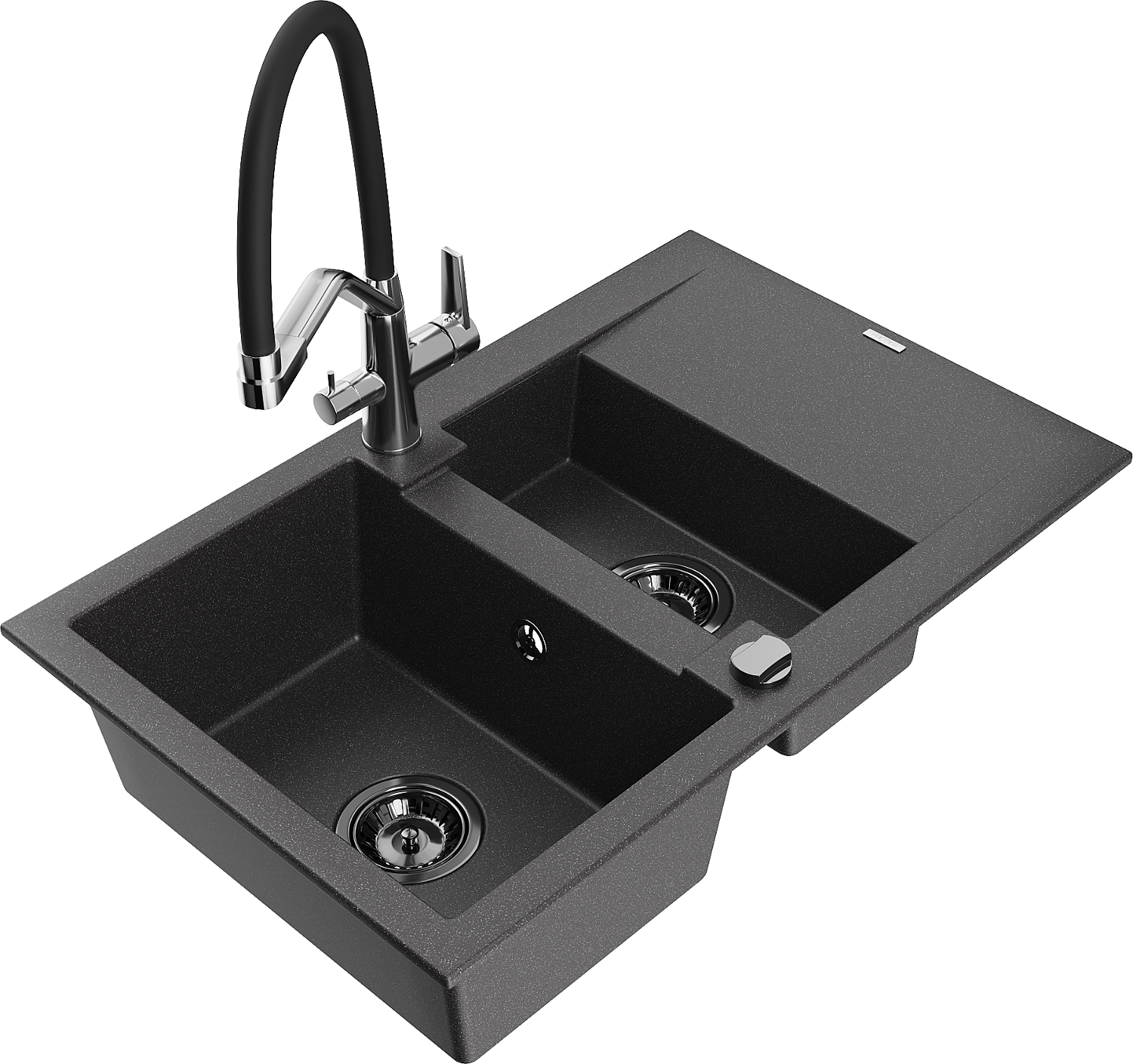 Mexen Gaspar gránit mosogató 1,5-medencés csepegtetővel és Duo konyhai csappal, fekete, pöttyös - 6507-76-671701-07-B