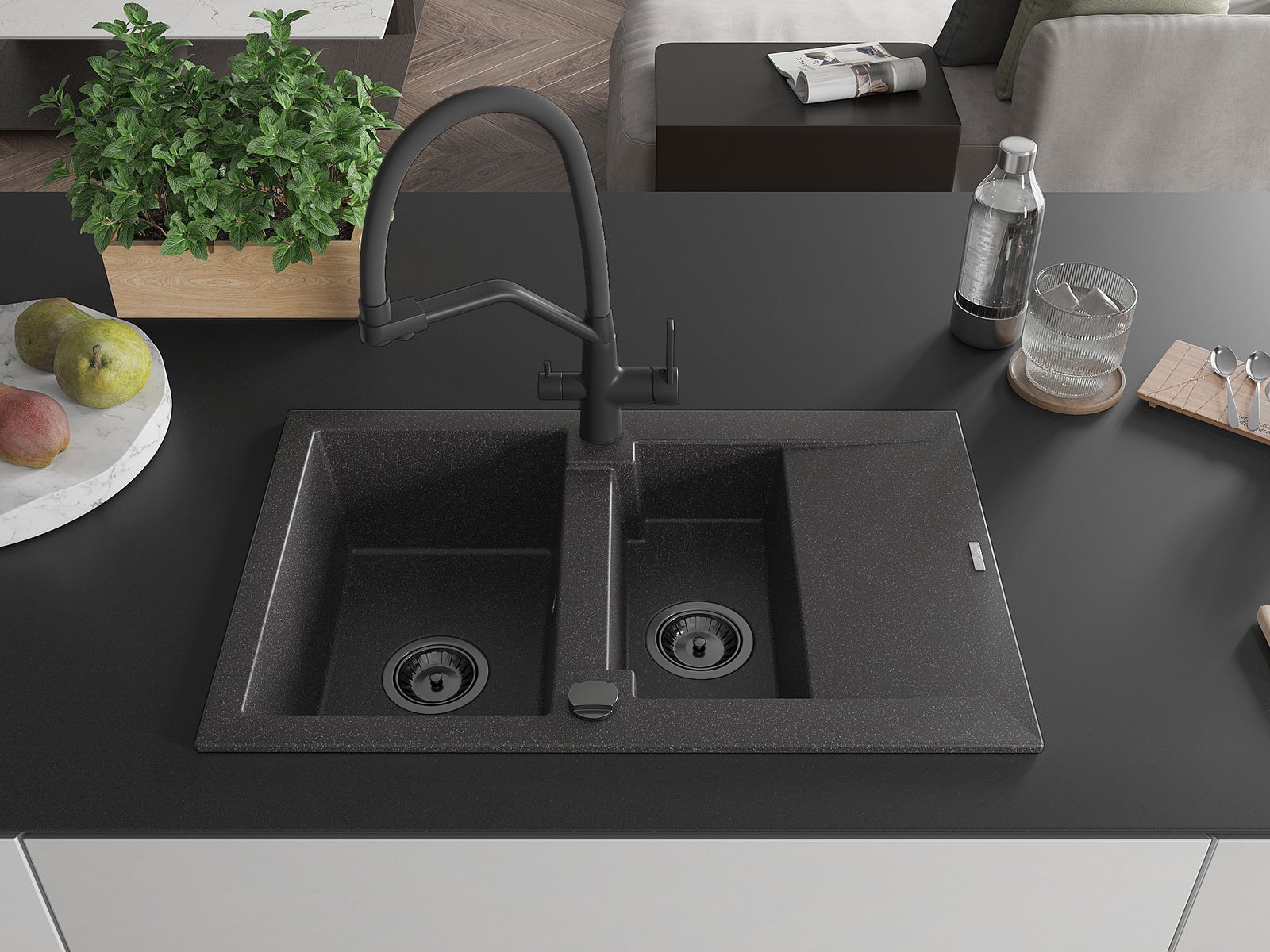 A mosogató kiváló minőségű gránitból készül. Ez egy elegáns és mindenekelőtt minden konyhához praktikus kiegészítés, stílusától függetlenül. A kiváló minőségű és a gránit tartósság biztosítja a sok éves használatát.