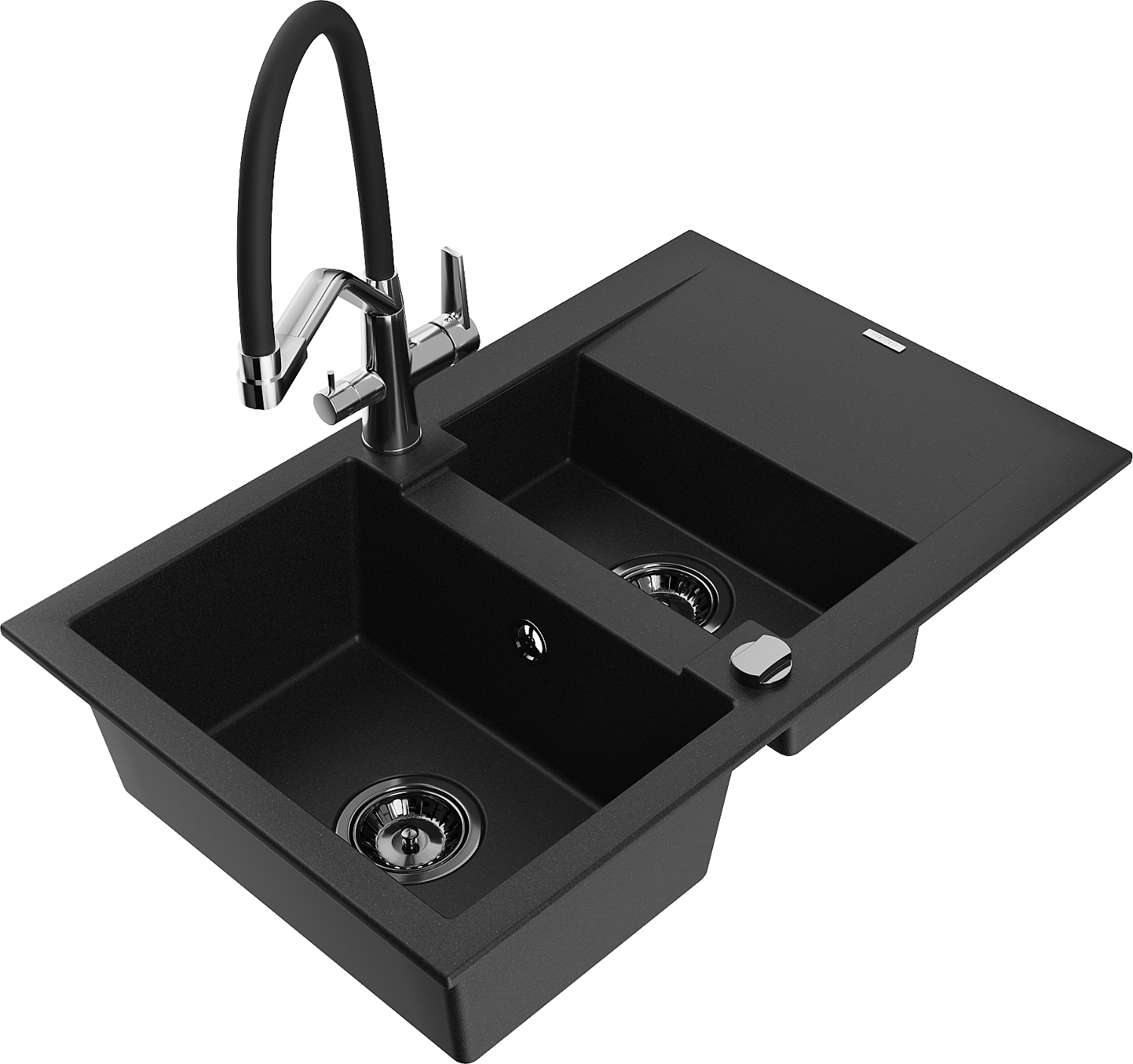 Mexen Gaspar 1,5 rekeszes gránit mosogató csepptálcával és Duo konyhai csapteleppel, fekete - 6507-77-671701-07-B