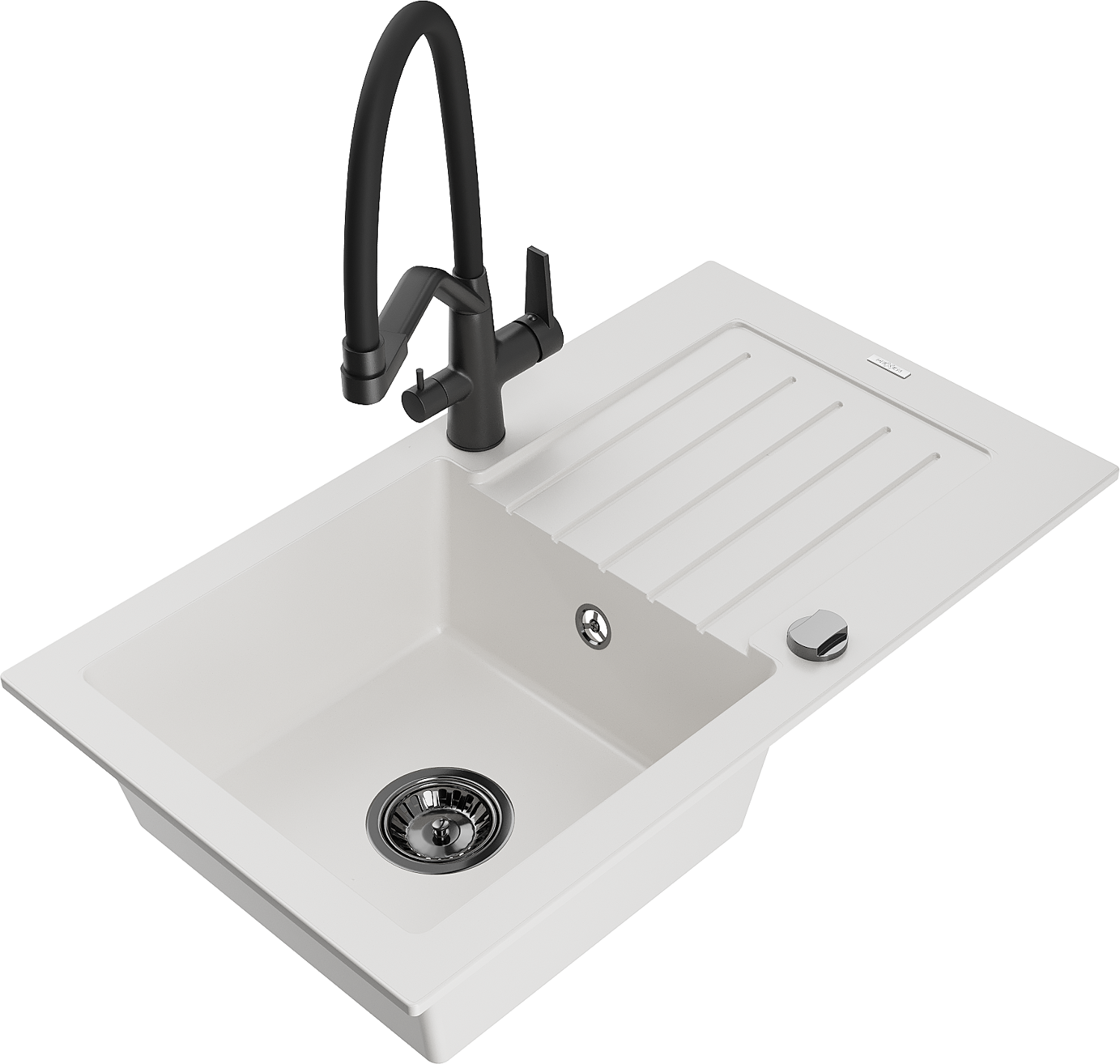 Mexen Pablo egytálcás gránit mosogató csepegtetővel és Duo konyhai csapteleppel, fehér - 6510-20-671701-70-B