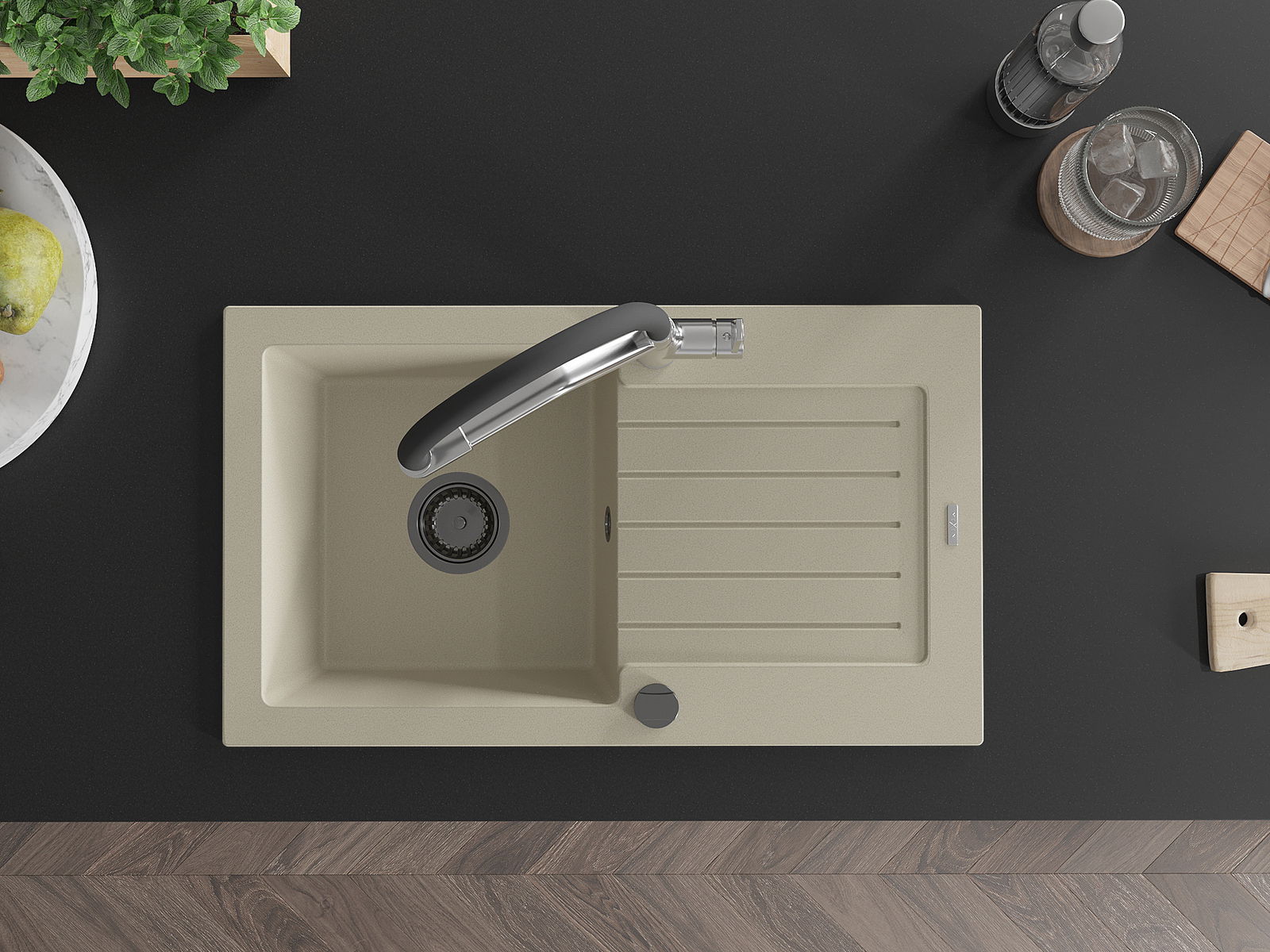 A mosogató kiváló minőségű gránitból készül. Ez egy elegáns és mindenekelőtt minden konyhához praktikus kiegészítés, stílusától függetlenül. A kiváló minőségű és a gránit tartósság biztosítja a sok éves használatát.
