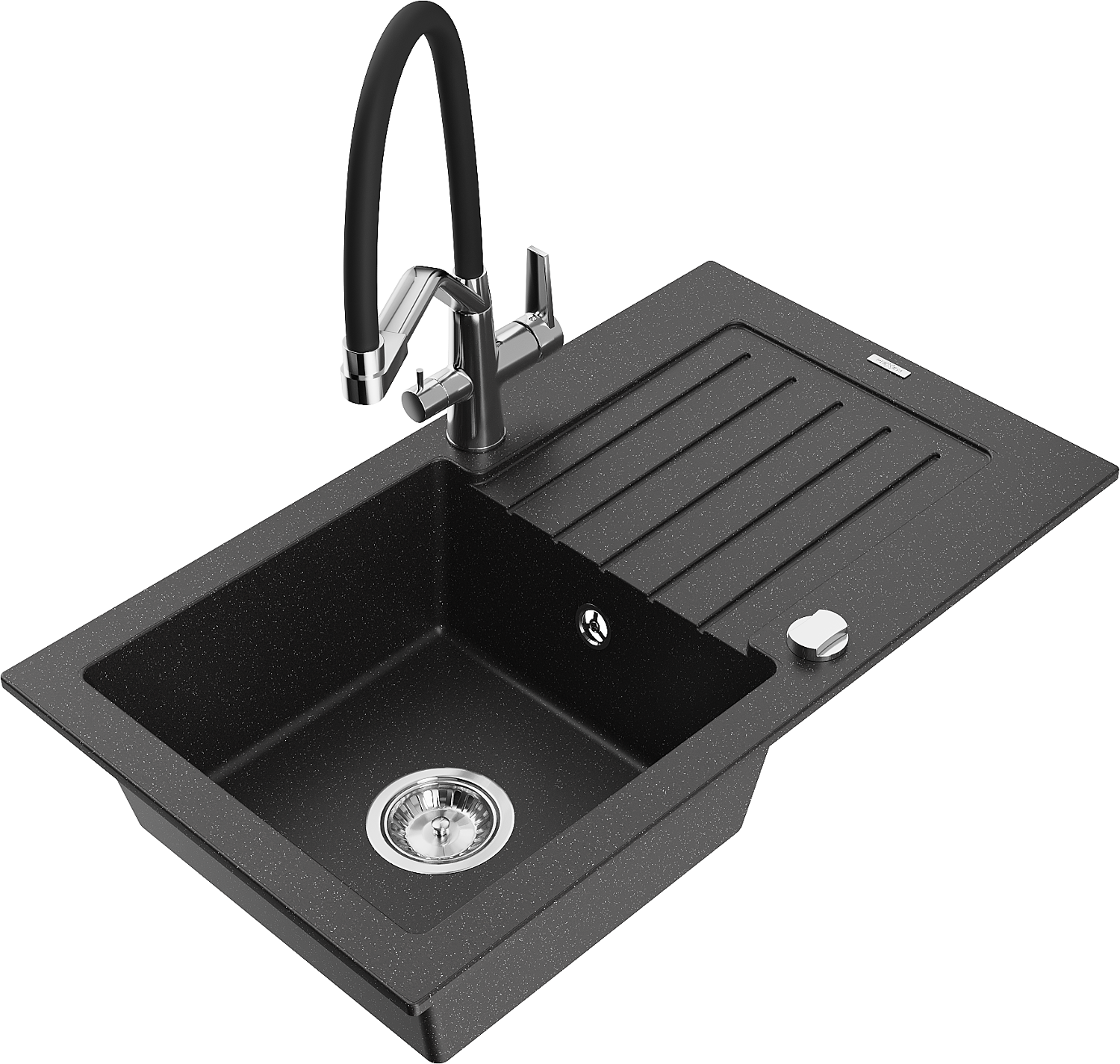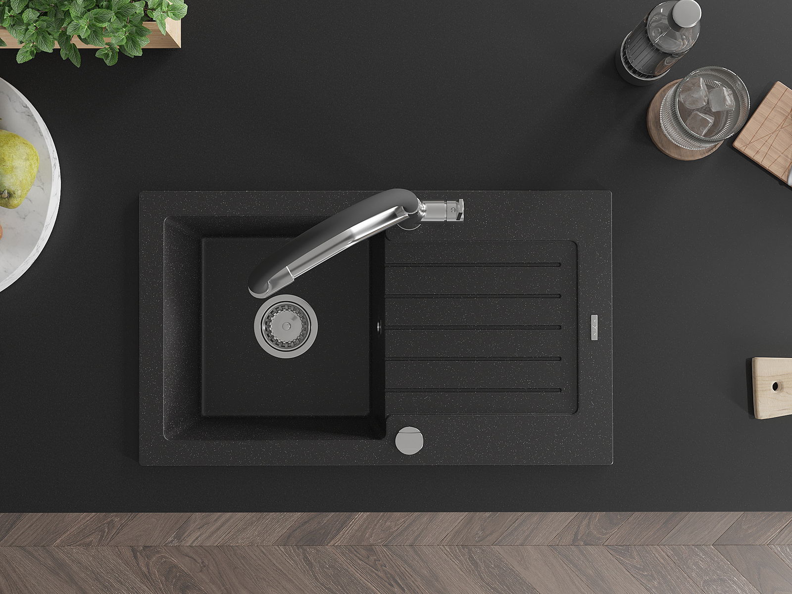 Mexen Pablo egykamrás gránit mosogató csepegtetőtálcával és Duo konyhai csapteleppel, fekete/ezüst metál - 6510-73-671701-07