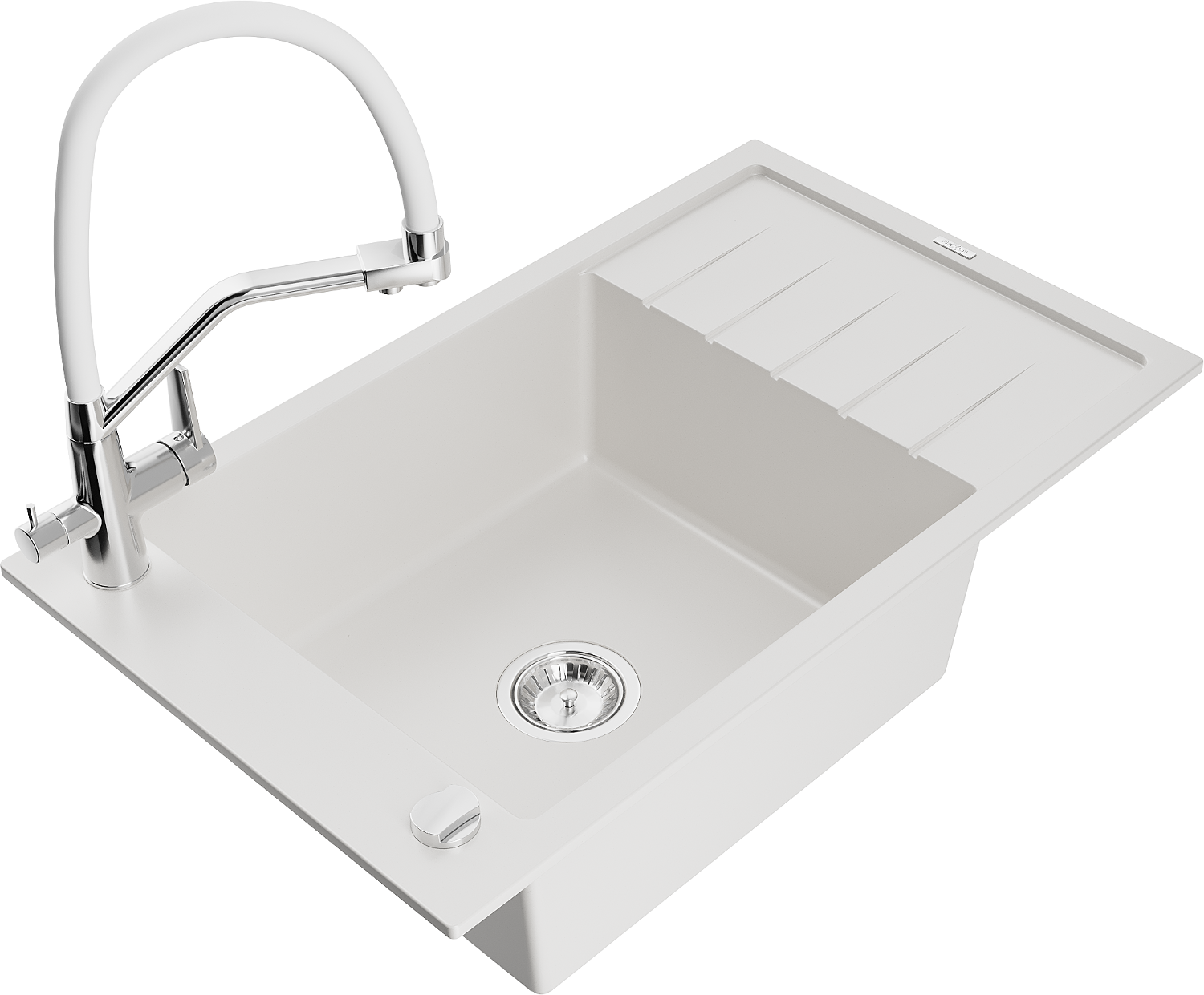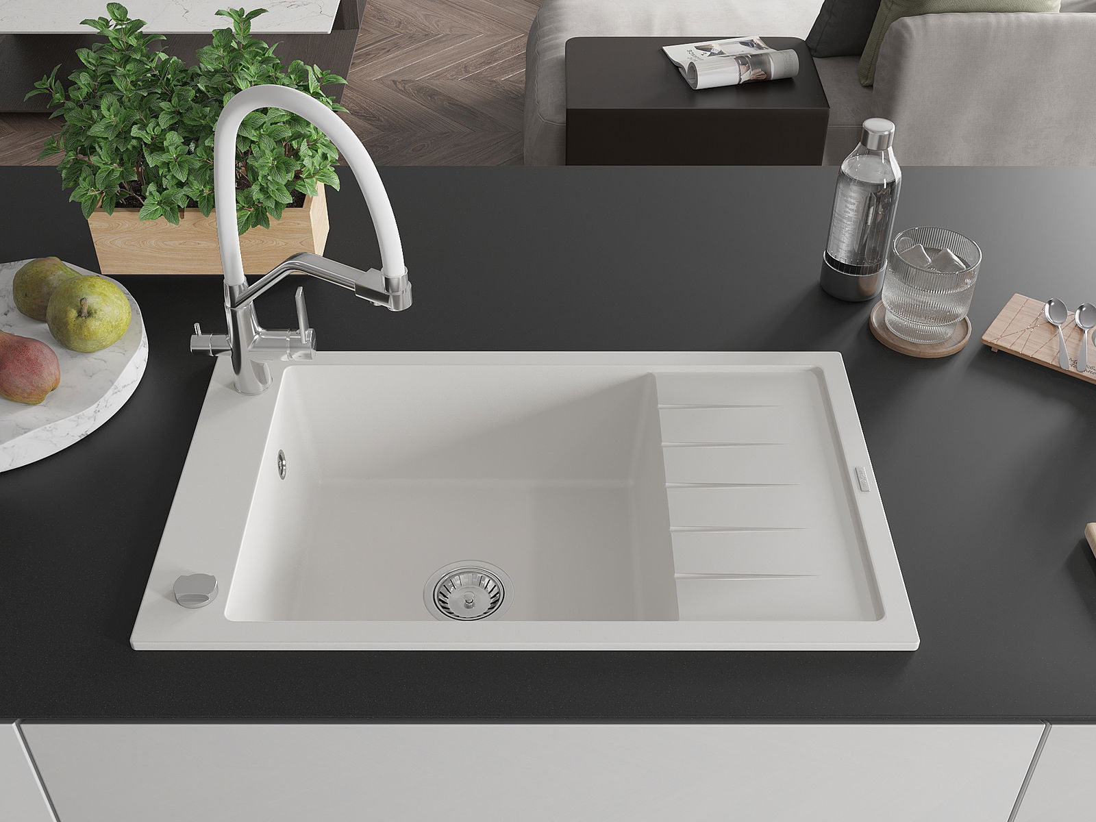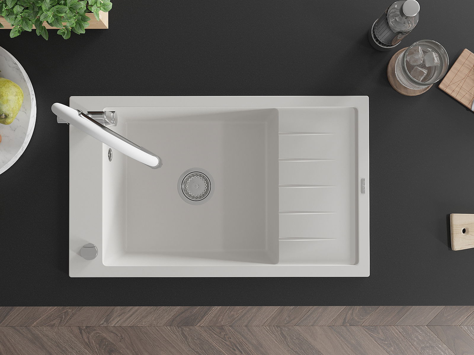 Mexen Elias egymedencés gránit mosogatótálca csepegtetővel és Duo konyhai csapteleppel, fehér - 6511-20-671701-02