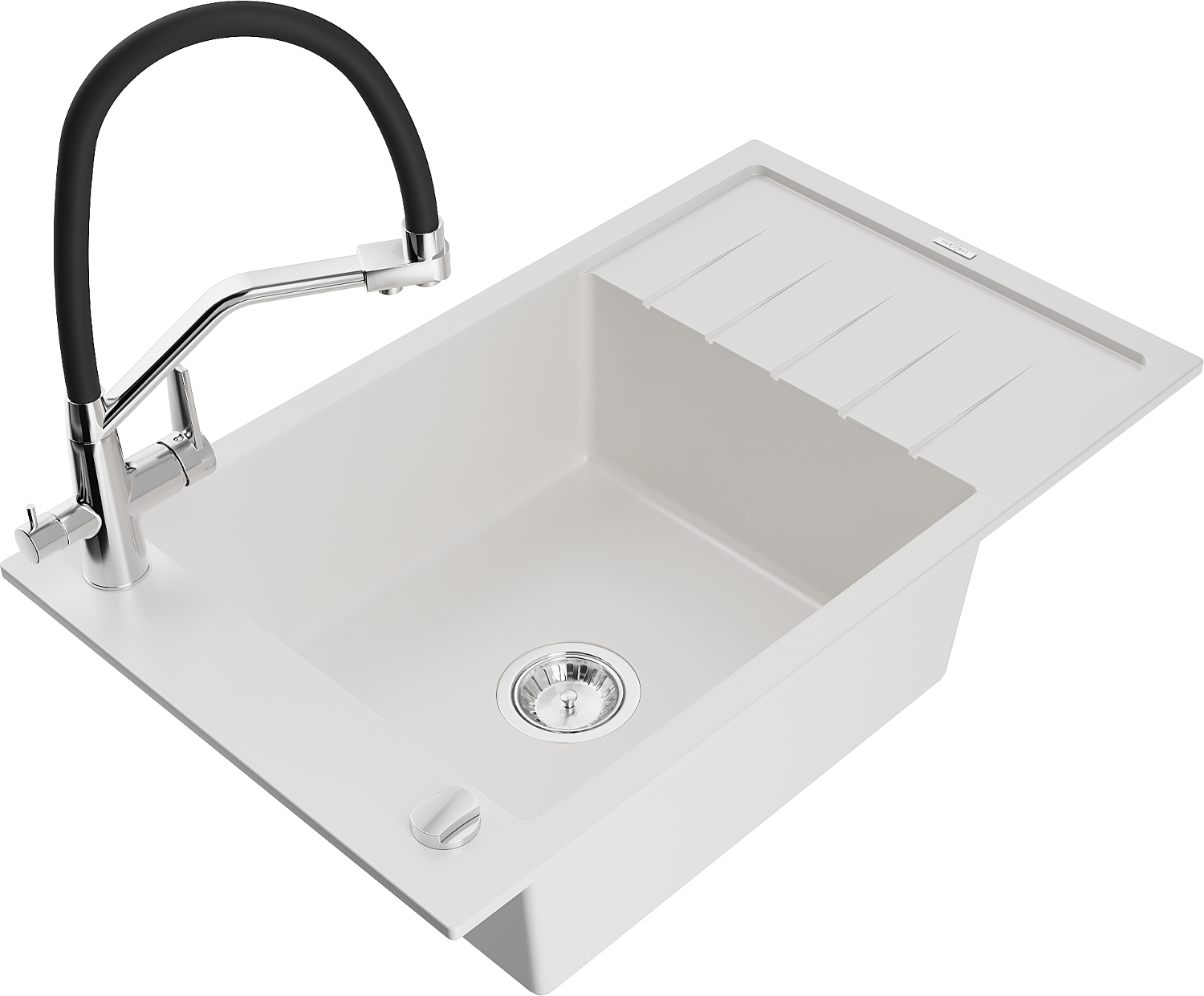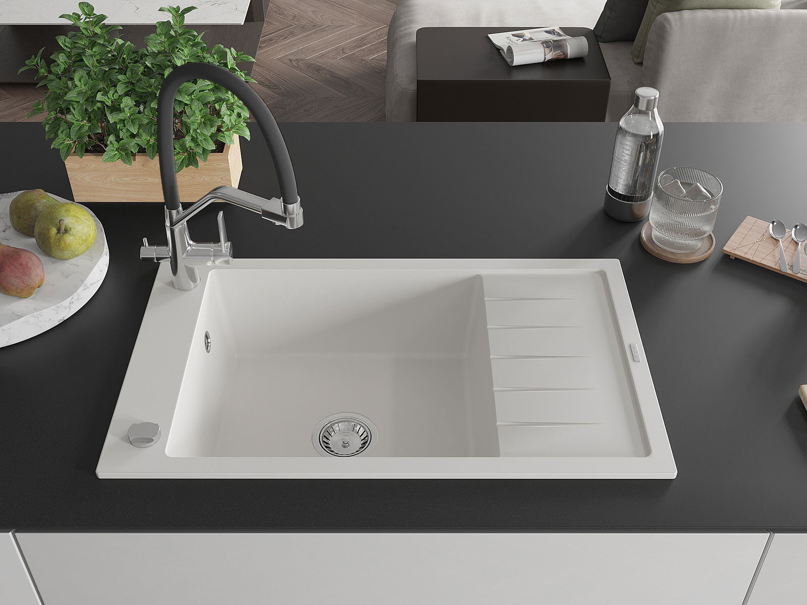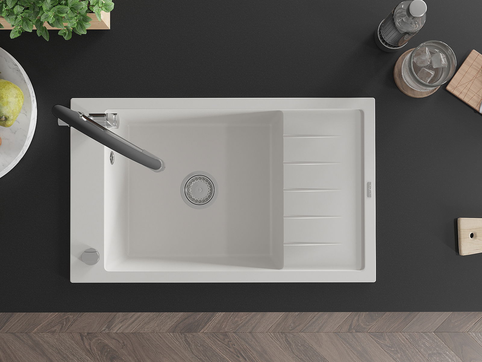 Mexen Elias gránit mosogató 1-medencés csepegtetővel és Duo konyhai csapteleppel, fehér - 6511-20-671701-07