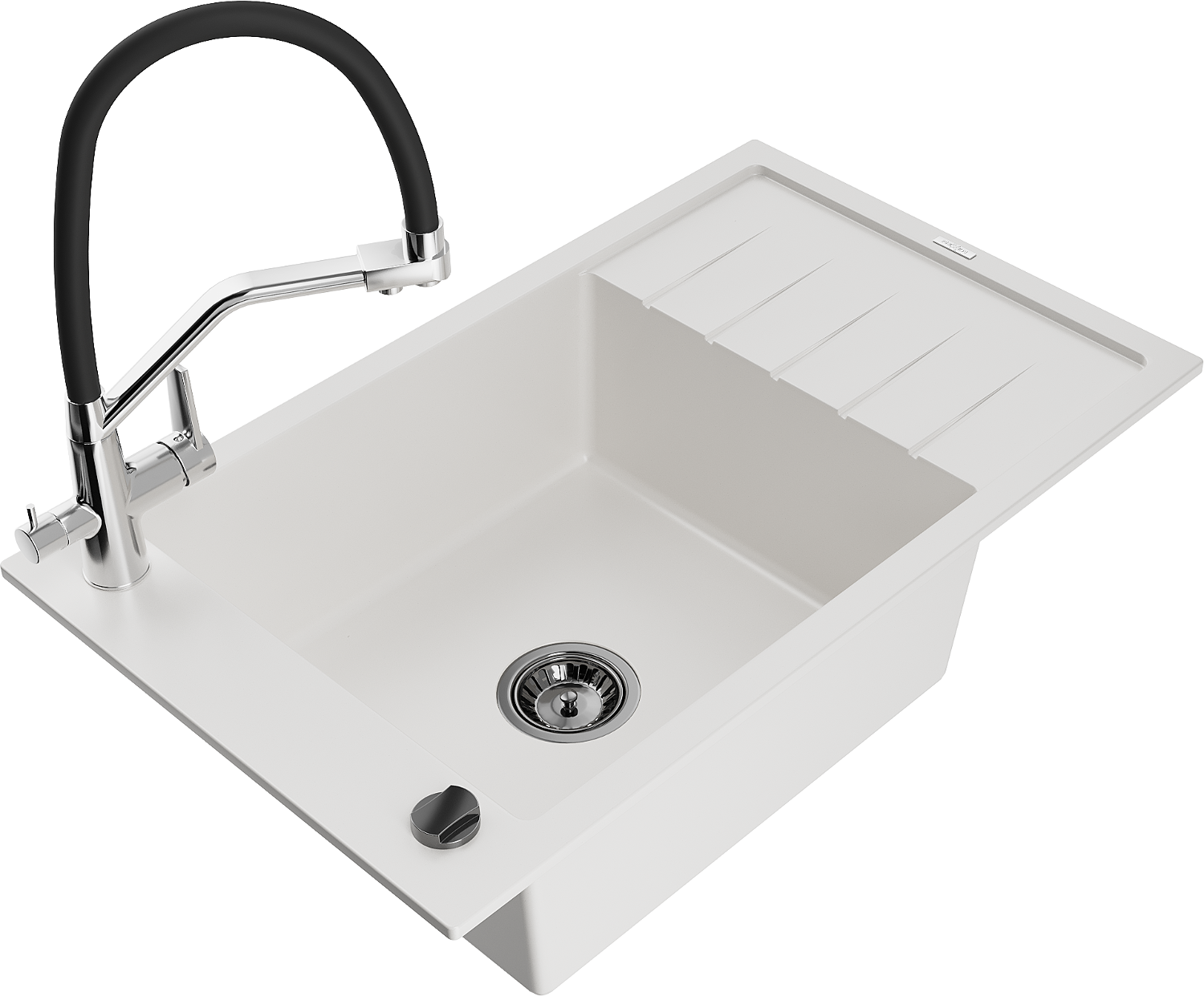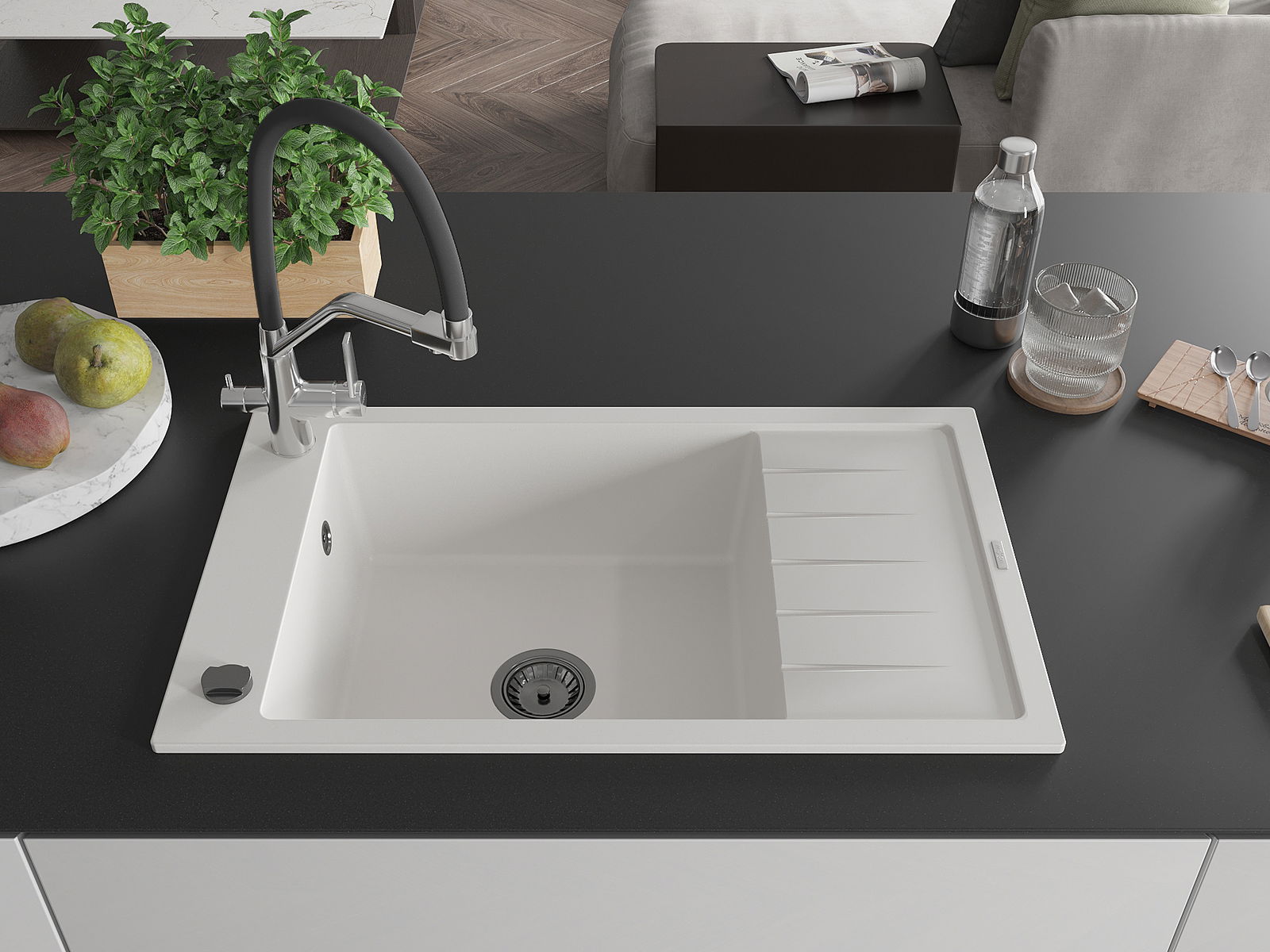 Mexen Elias gránit mosogató 1-medencés csepegtetővel és Duo konyhai csapteleppel, fehér - 6511-20-671701-07-B