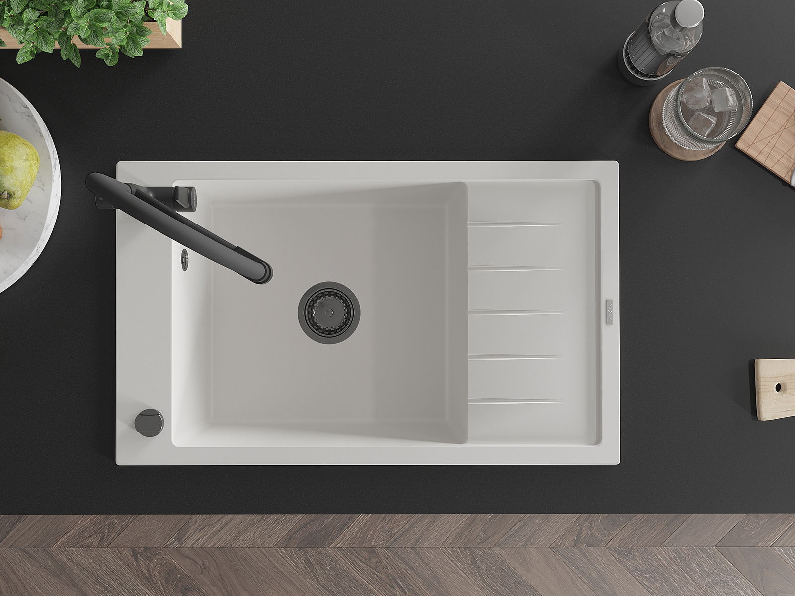 Mexen Elias 1 rekeszes gránit mosogató csepegtetővel és Duo konyhai csapteleppel, fehér - 6511-20-671701-70-B
