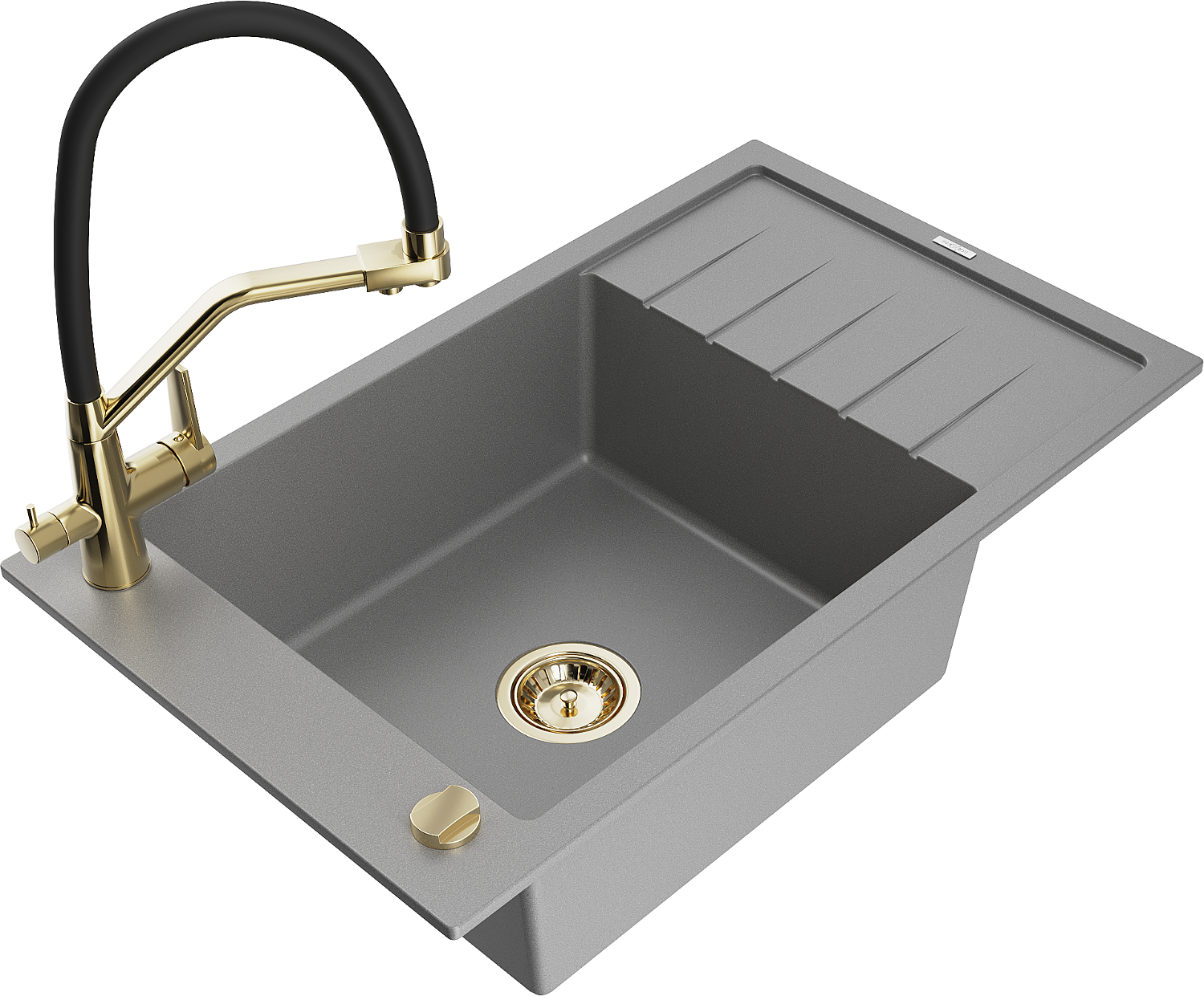 Mexen Elias egykamrás gránit mosogató csepptálcával és Duo konyhai csapteleppel, szürke - 6511-71-671701-57-G
