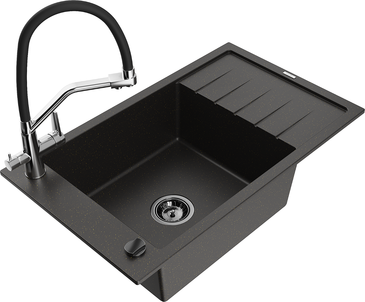 Mexen Elias egymedencés gránit mosogató csepegtetővel és Duo konyhai csapteleppel, fekete/arany metál - 6511-75-671701-07-B