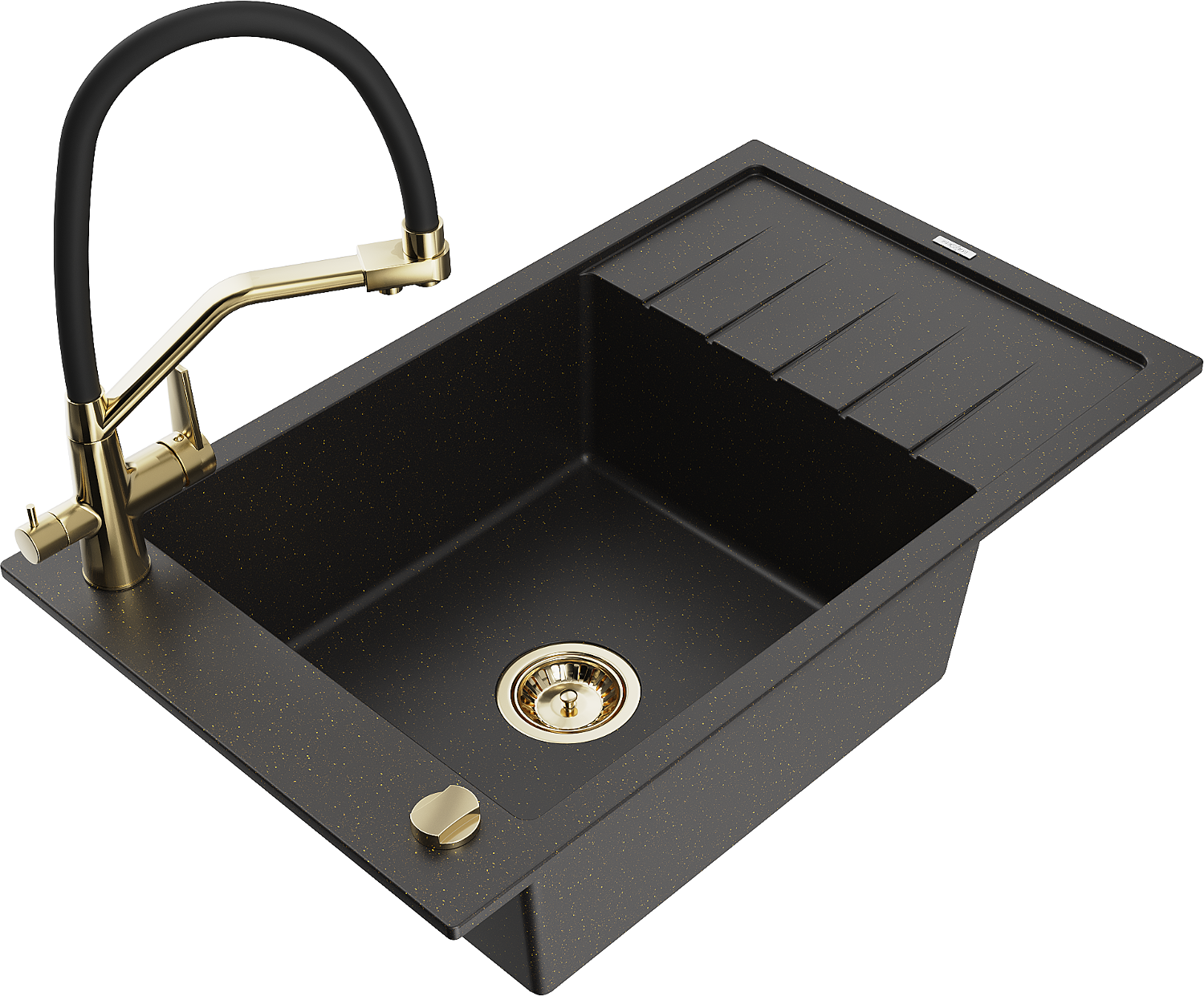 Mexen Elias 1-medencés gránit mosogató csepptálcával és Duo konyhai csappal, fekete/arany metál - 6511-75-671701-57-G