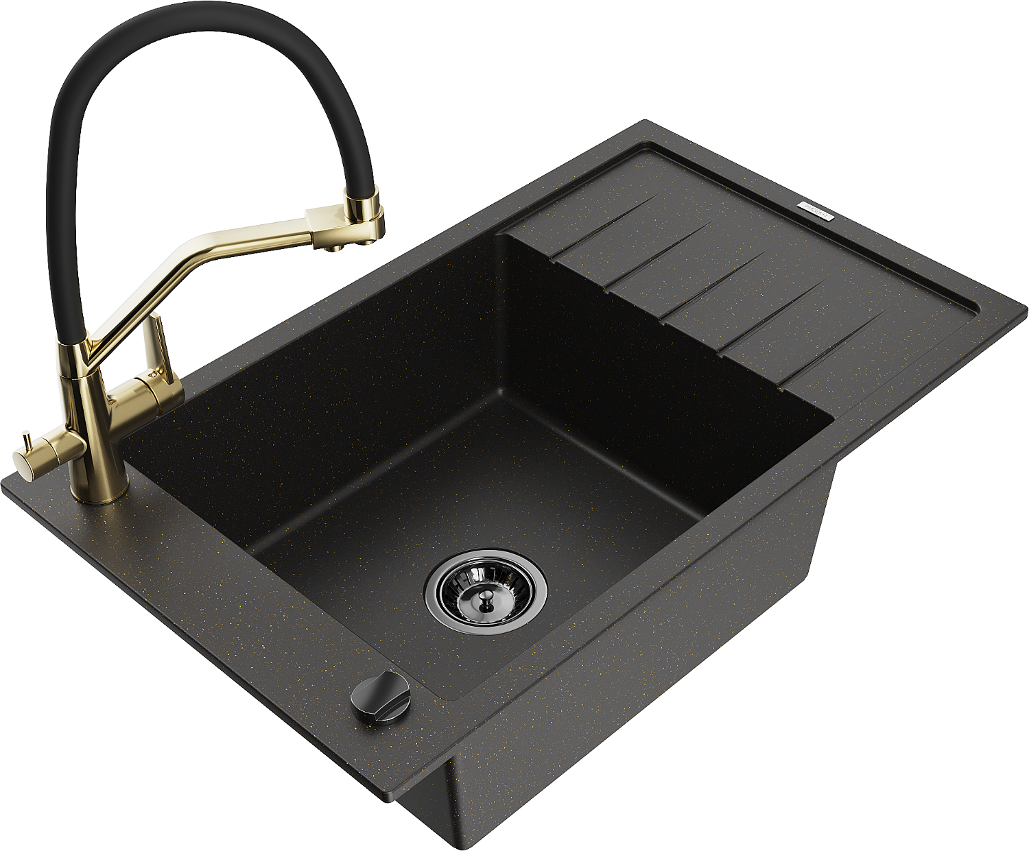 Mexen Elias 1-medencés gránit mosogató csepegtetővel és konyhai csapteleppel Duo, fekete/arany metál - 6511-75-671701-57-B
