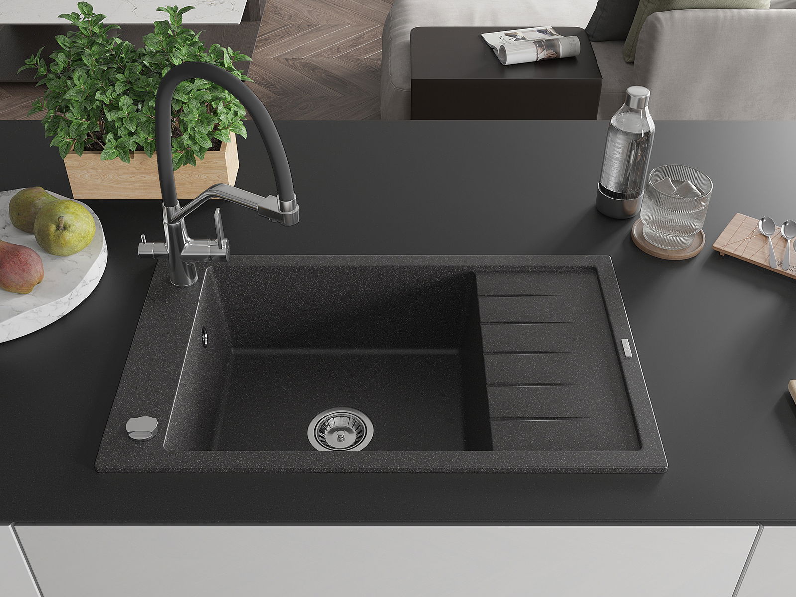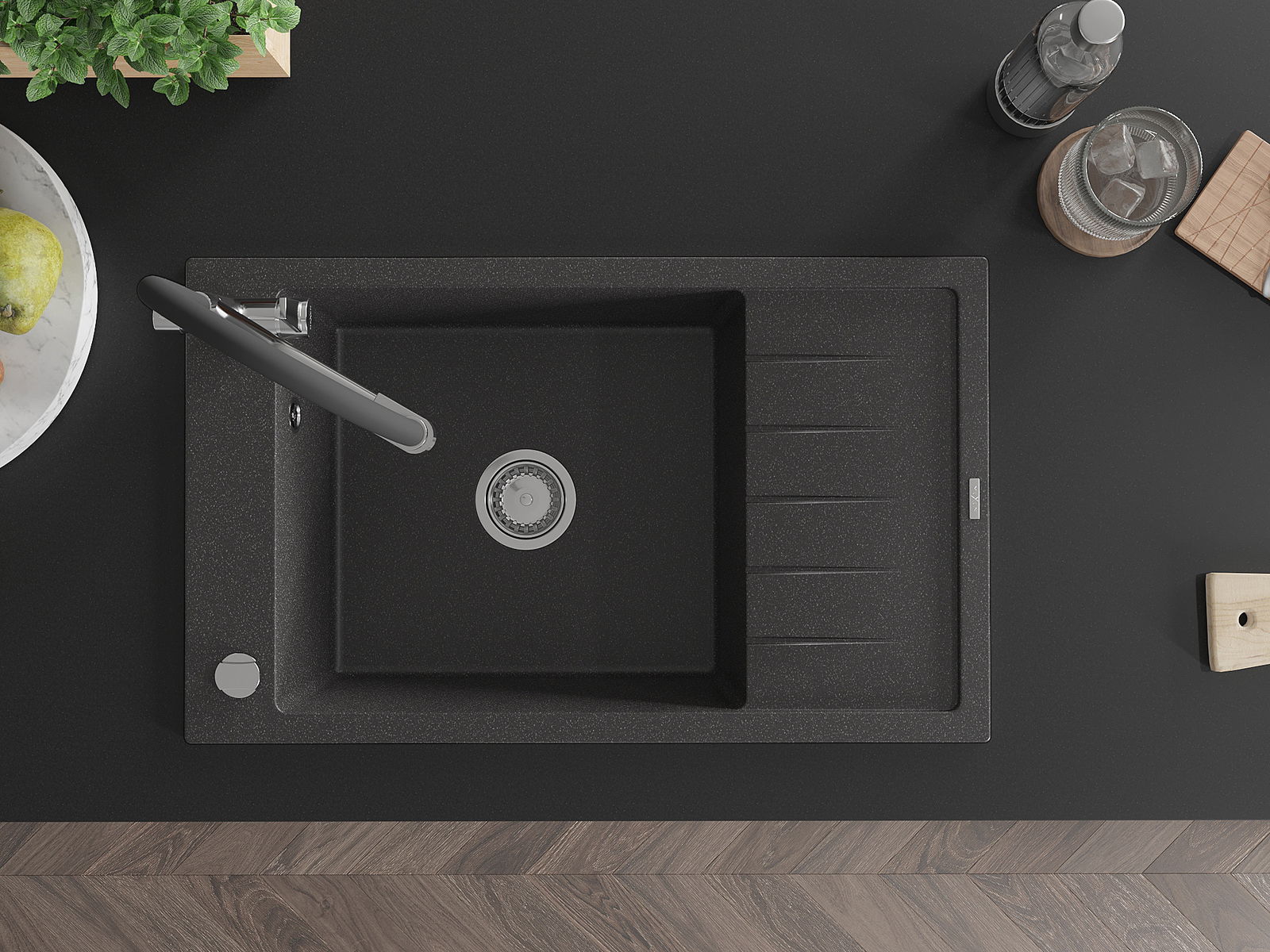 A mosogató kiváló minőségű gránitból készül. Ez egy elegáns és mindenekelőtt minden konyhához praktikus kiegészítés, stílusától függetlenül. A kiváló minőségű és a gránit tartósság biztosítja a sok éves használatát.