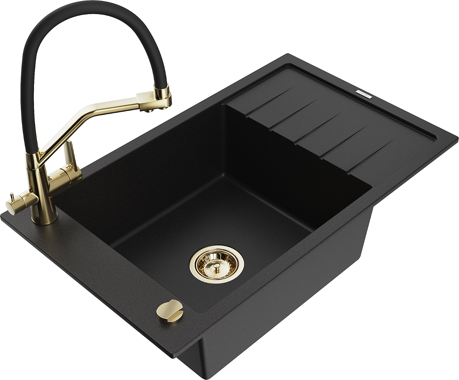 Mexen Elias egymedencés gránit mosogató lecsöpögtetővel és Duo konyhai csapteleppel, fekete - 6511-77-671701-57-G