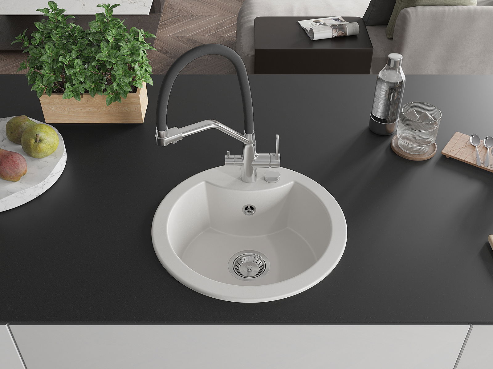 A mosogató kiváló minőségű gránitból készül. Ez egy elegáns és mindenekelőtt minden konyhához praktikus kiegészítés, stílusától függetlenül. A kiváló minőségű és a gránit tartósság biztosítja a sok éves használatát.
