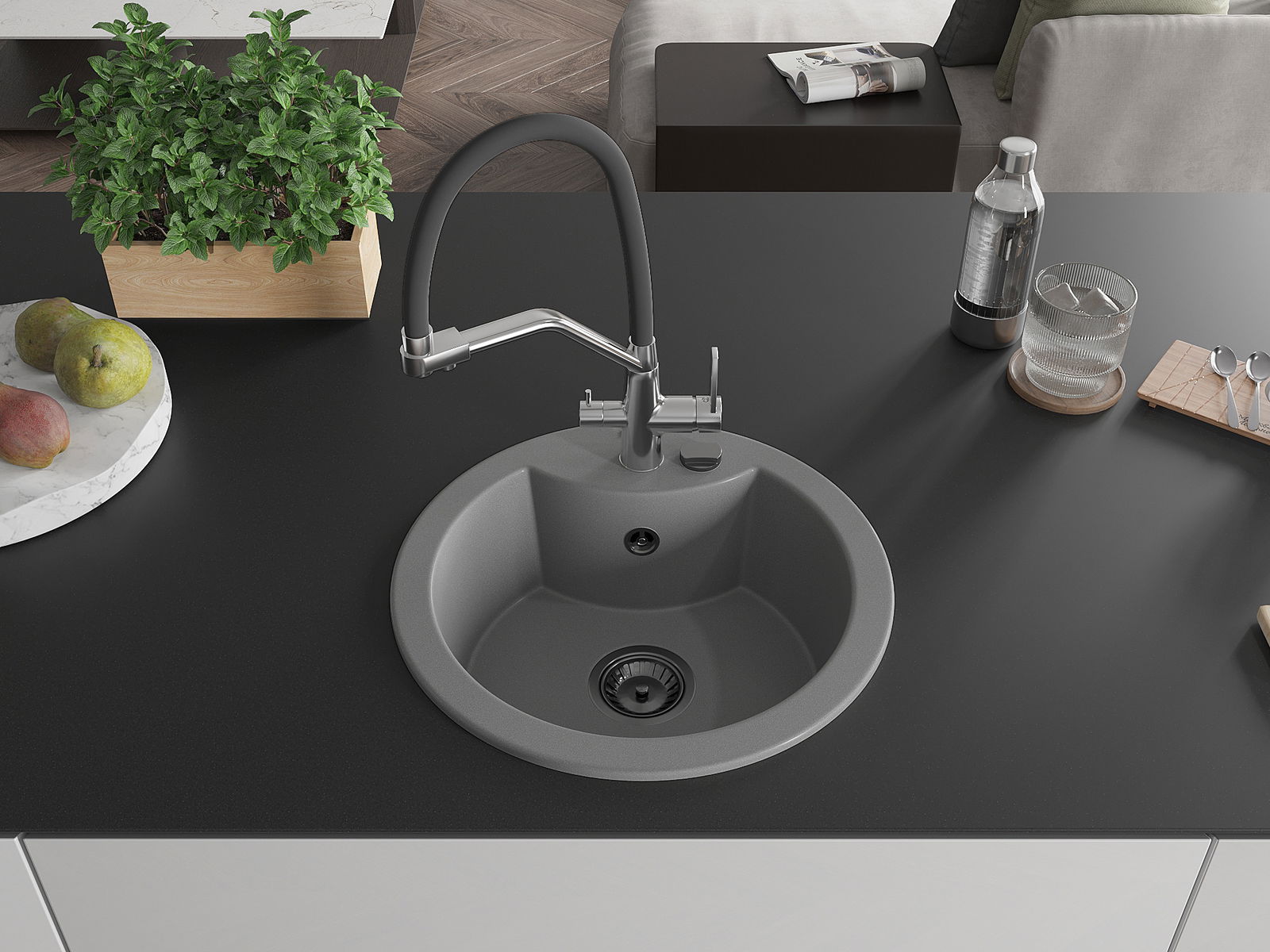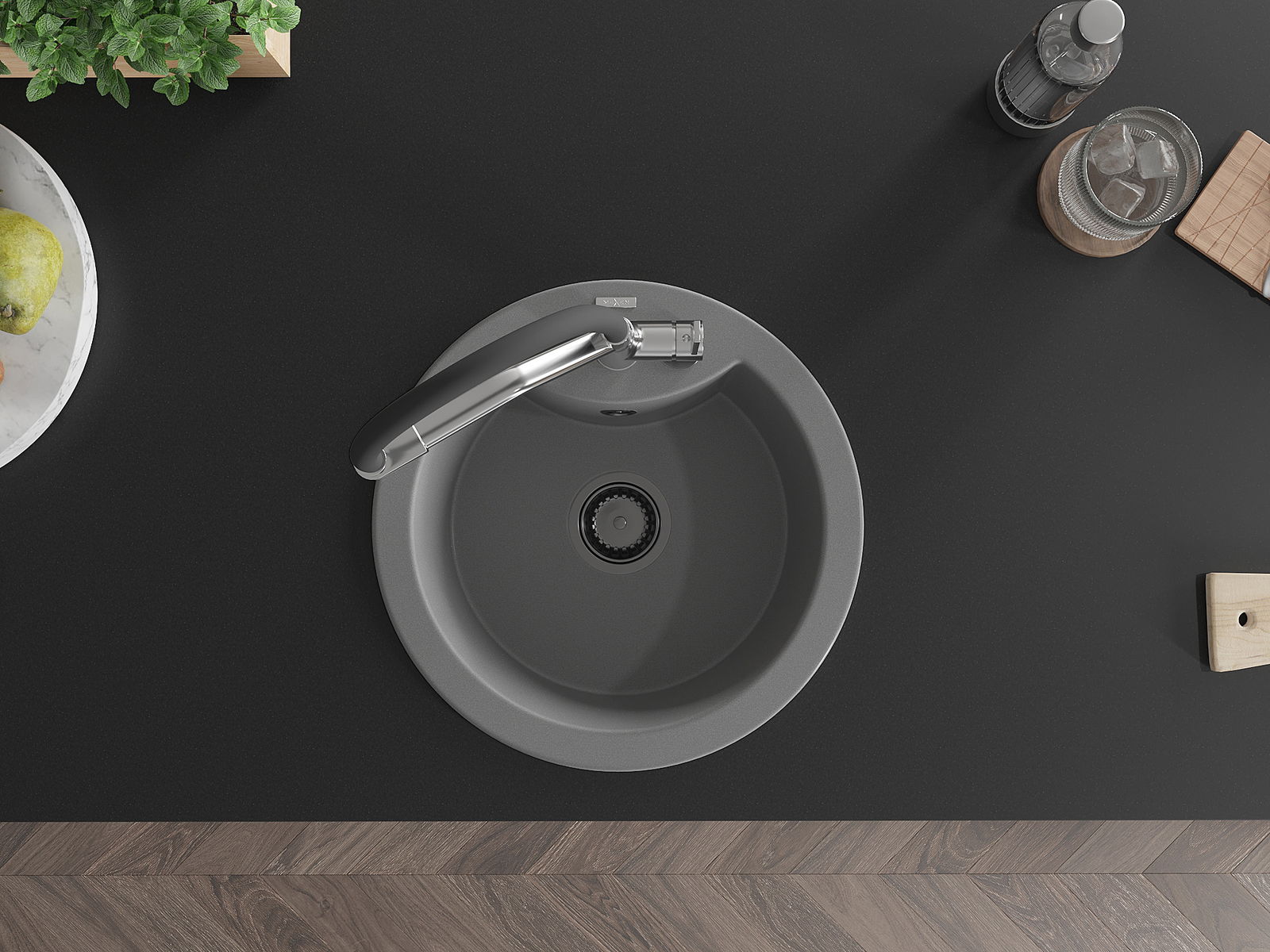 A mosogató kiváló minőségű gránitból készül. Ez egy elegáns és mindenekelőtt minden konyhához praktikus kiegészítés, stílusától függetlenül. A kiváló minőségű és a gránit tartósság biztosítja a sok éves használatát.