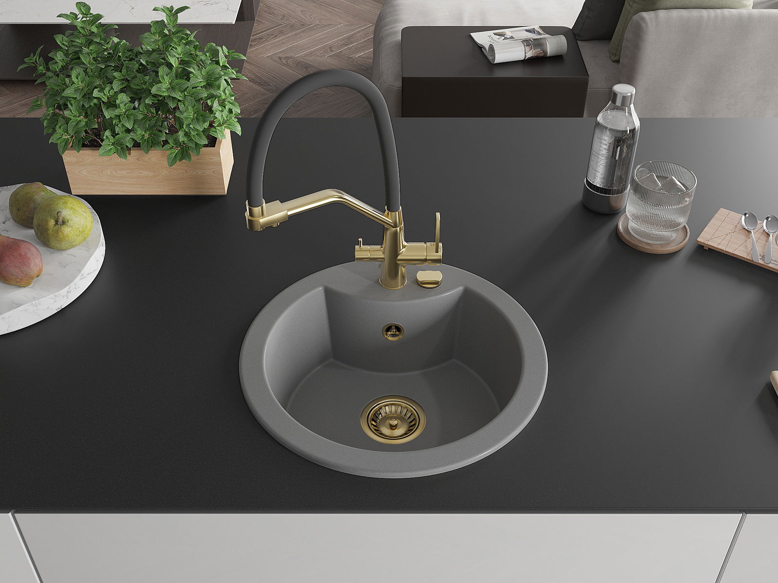 A mosogató kiváló minőségű gránitból készül. Ez egy elegáns és mindenekelőtt minden konyhához praktikus kiegészítés, stílusától függetlenül. A kiváló minőségű és a gránit tartósság biztosítja a sok éves használatát.