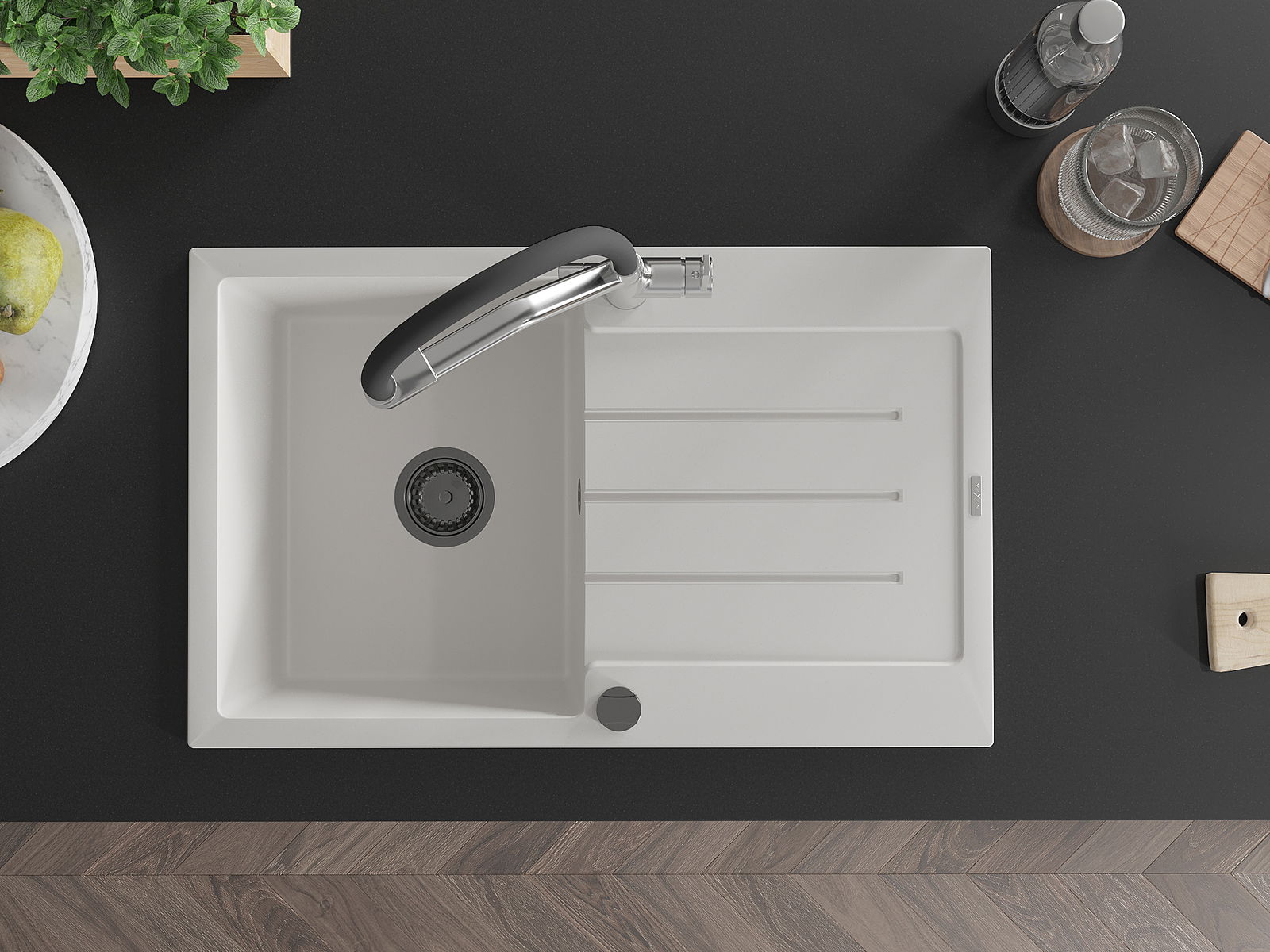 Mexen Bruno egykamrás gránit mosogató csepegtetővel és Duo konyhai csappal, fehér - 6513-20-671701-07-B